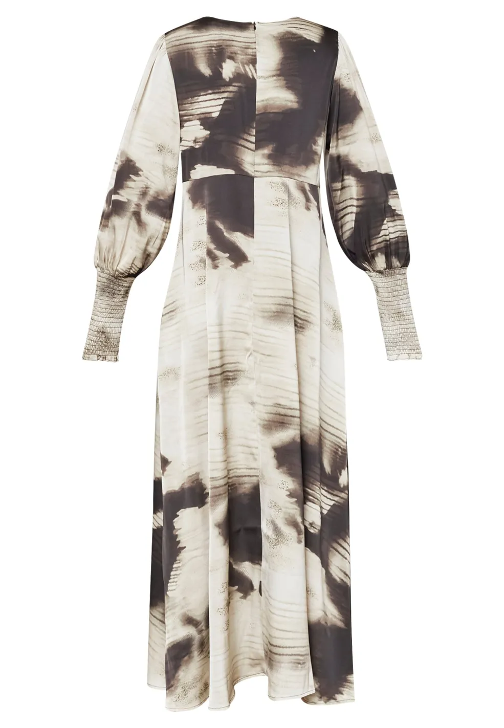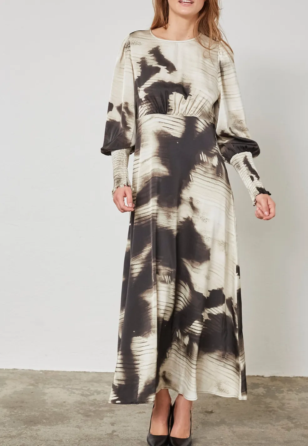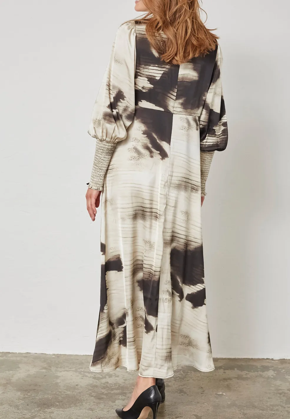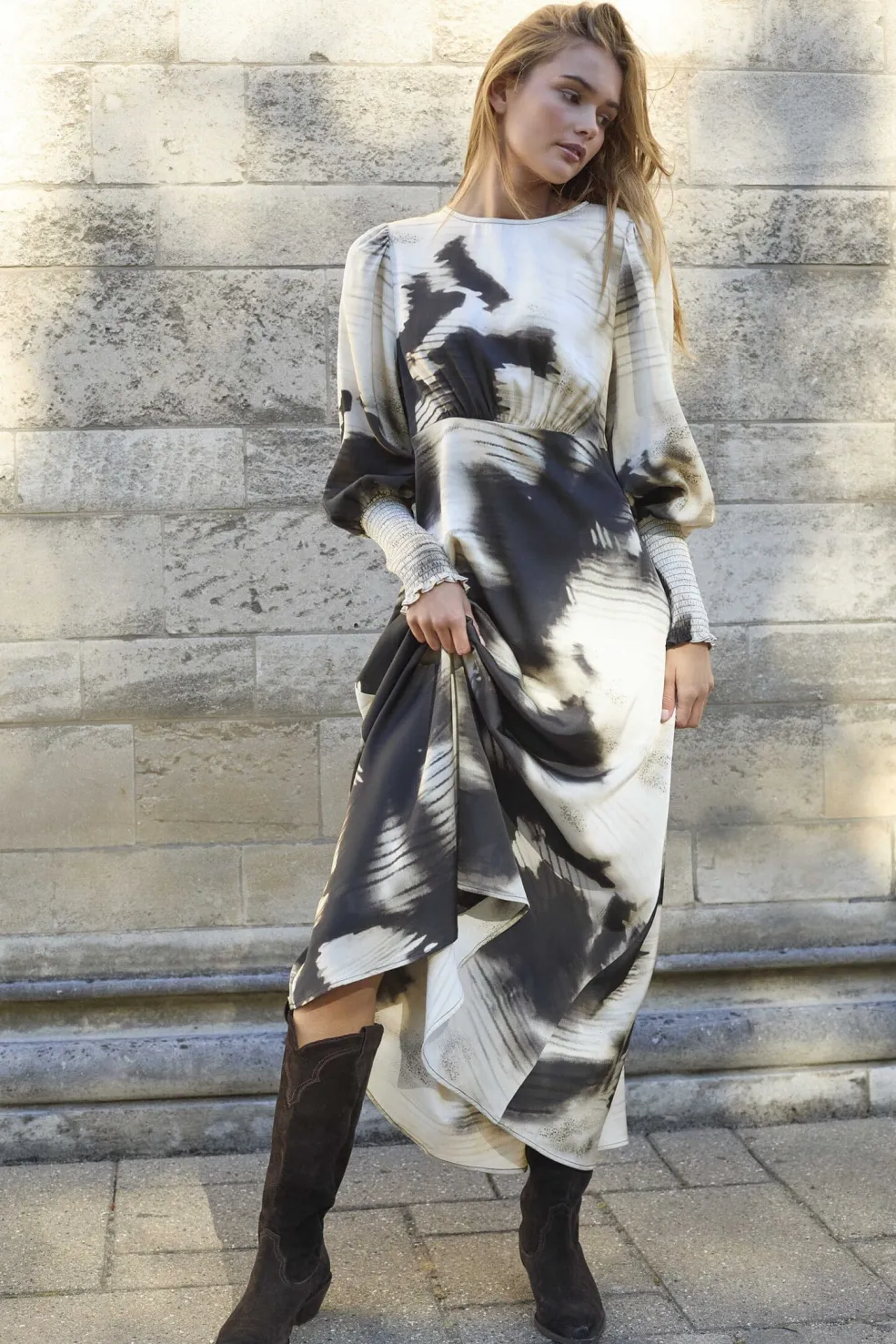 Grafisk kjole fra Love & Divine med et sort-hvidt mønster. Kjolen har lange ærmer, rund halsudskæring og går til midt på læggen.