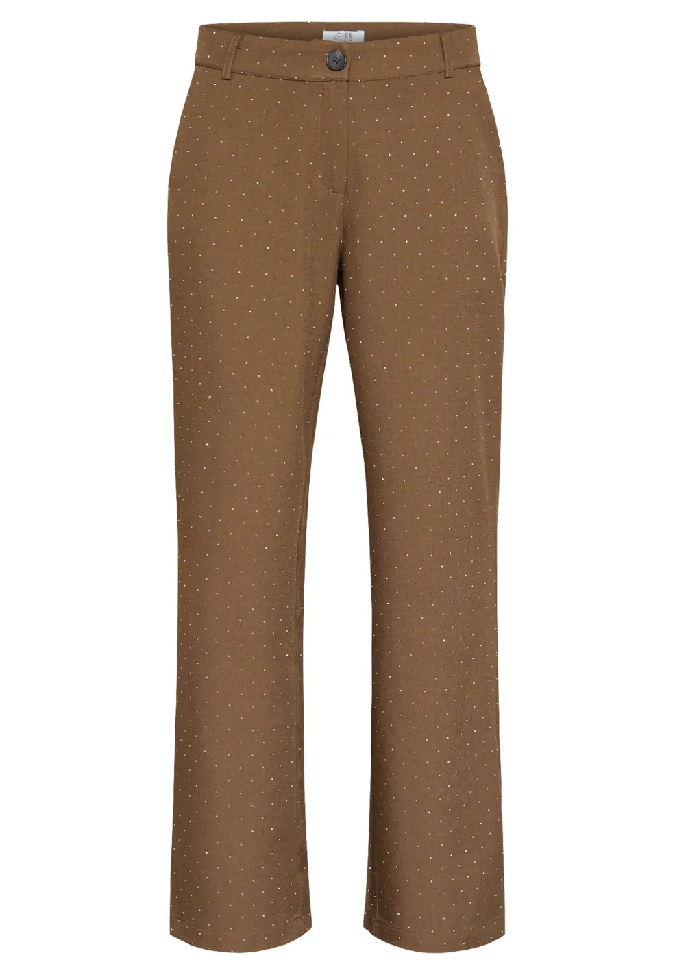 Brune bukser fra Love & Divine med små rhinestone-detaljer over hele stoffet. Bukserne er en del af et jakkesæt med en matchende blazer.
