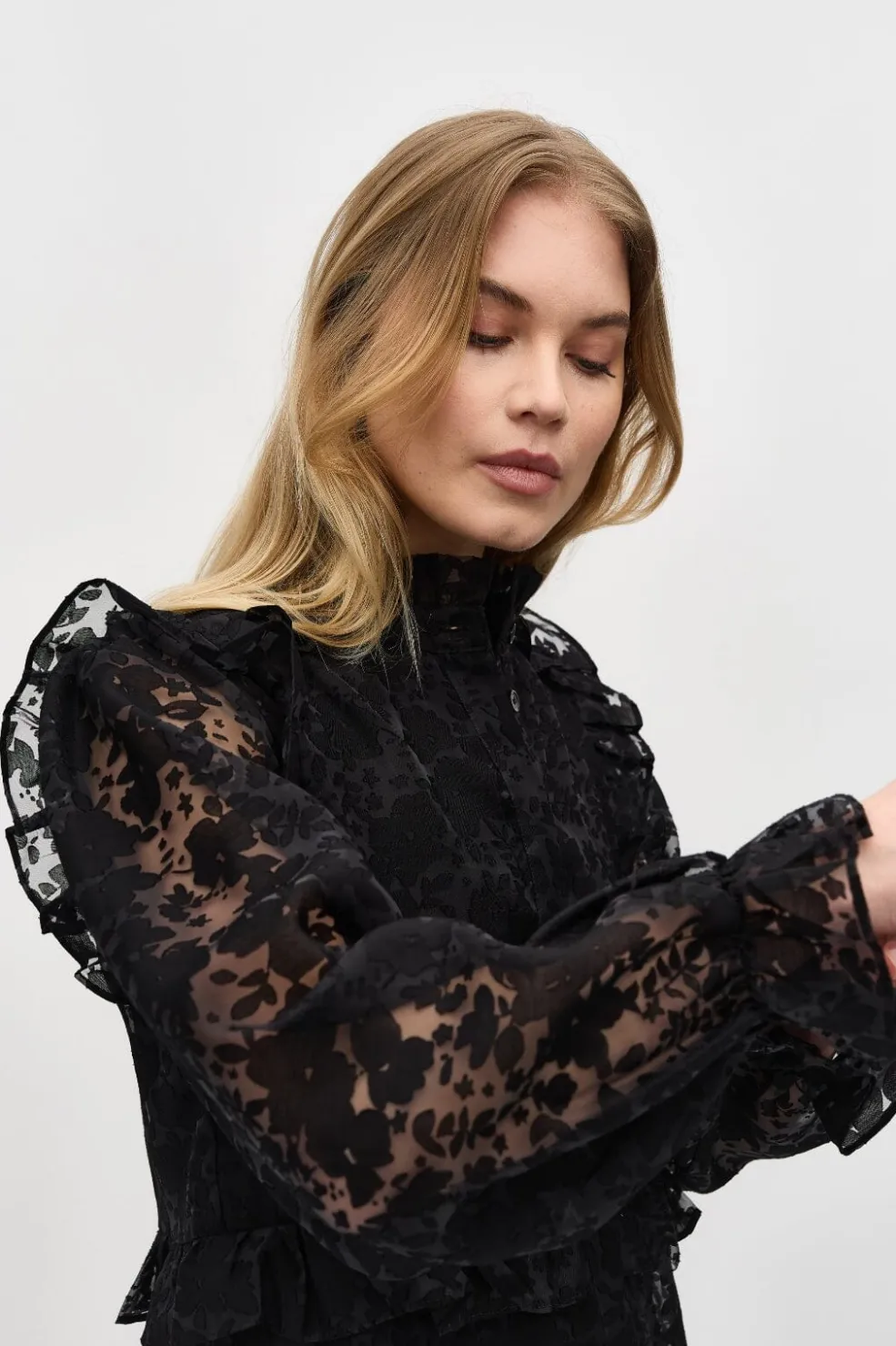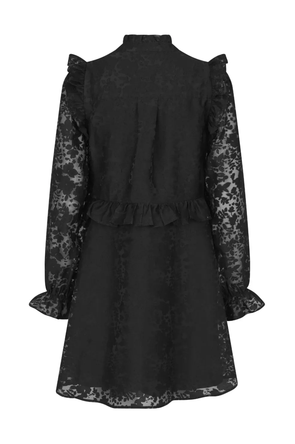 Sort festkjole fra MbyM med gennemsigtigt blondestof og blomstermønster. Kjolen har høj hals, lange ærmer og når til midt på låret.