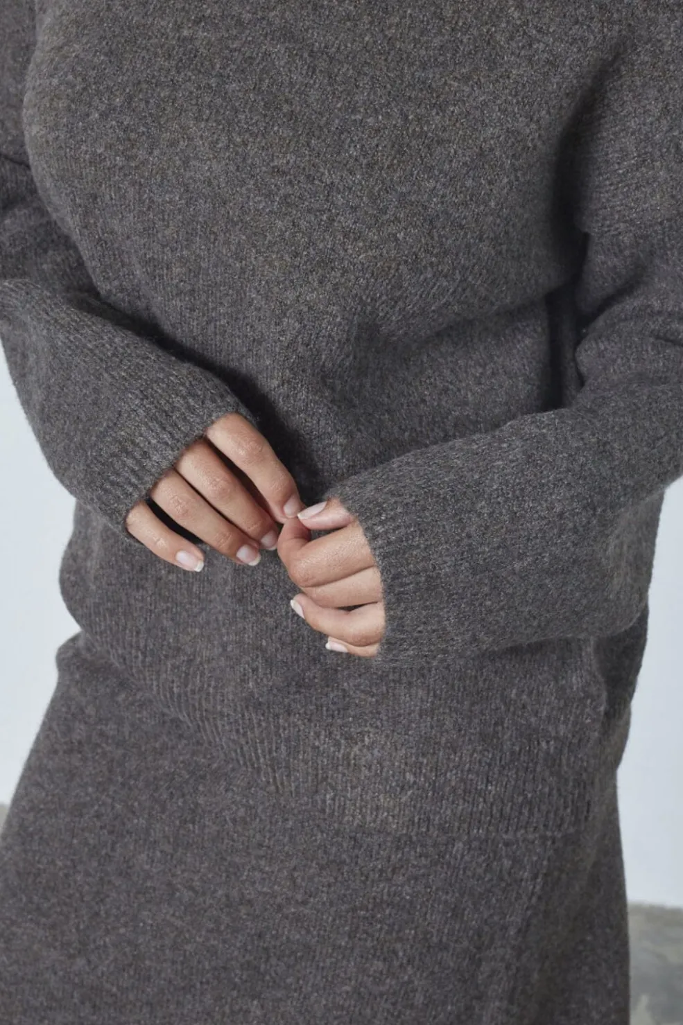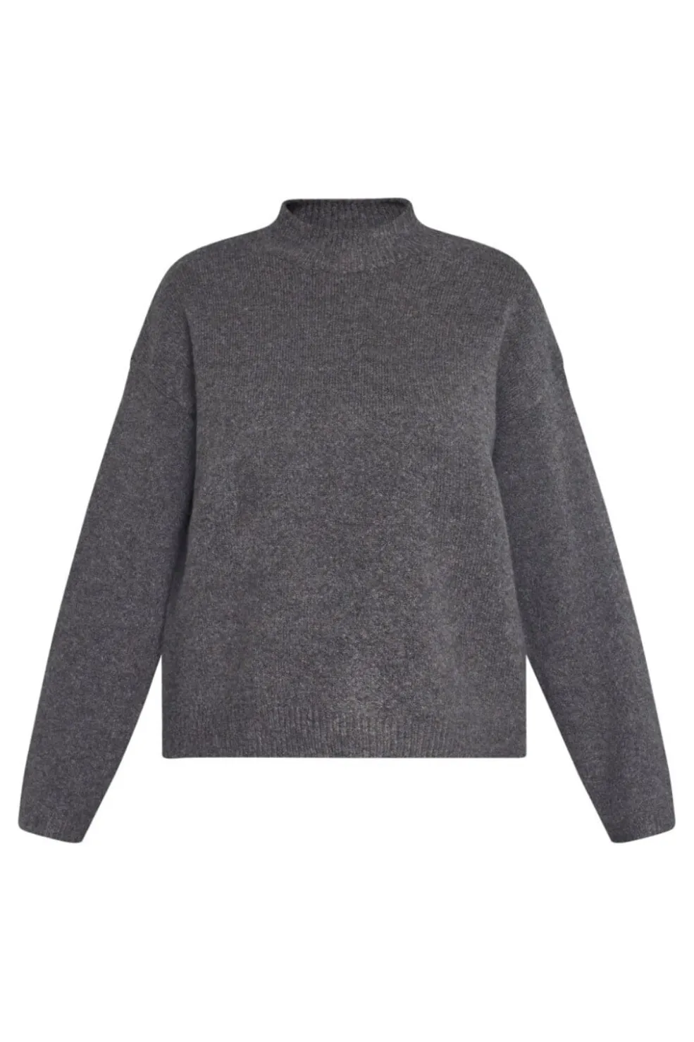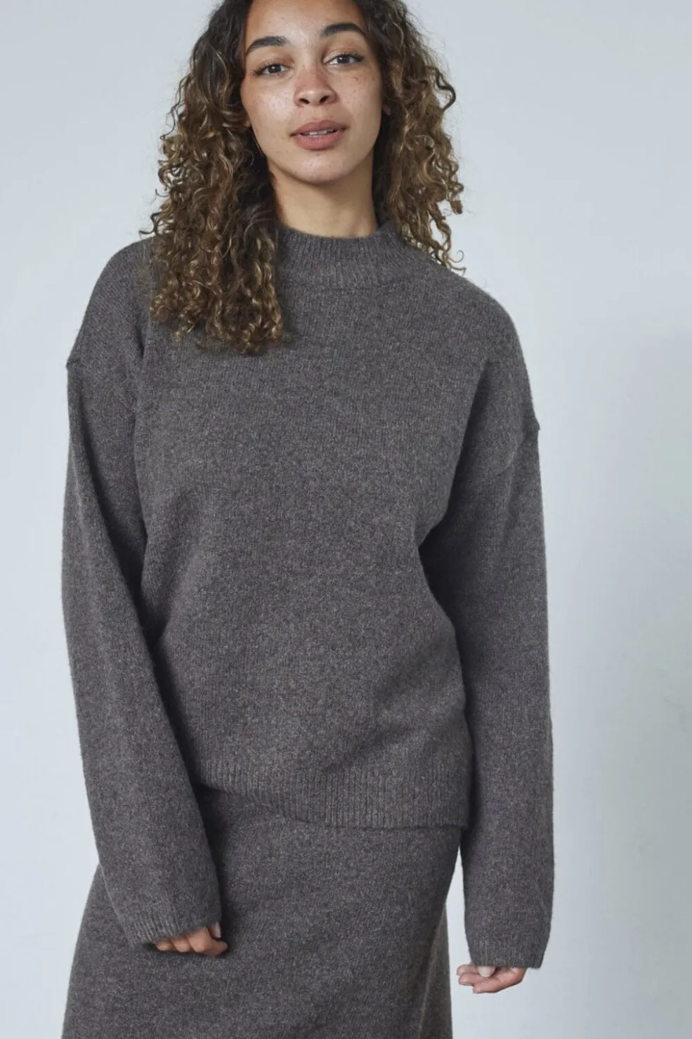 Strikket sweater fra Sisters Point i brun og grå melange. Sweateren har høj halsudskæring, lange ærmer og en løs pasform.