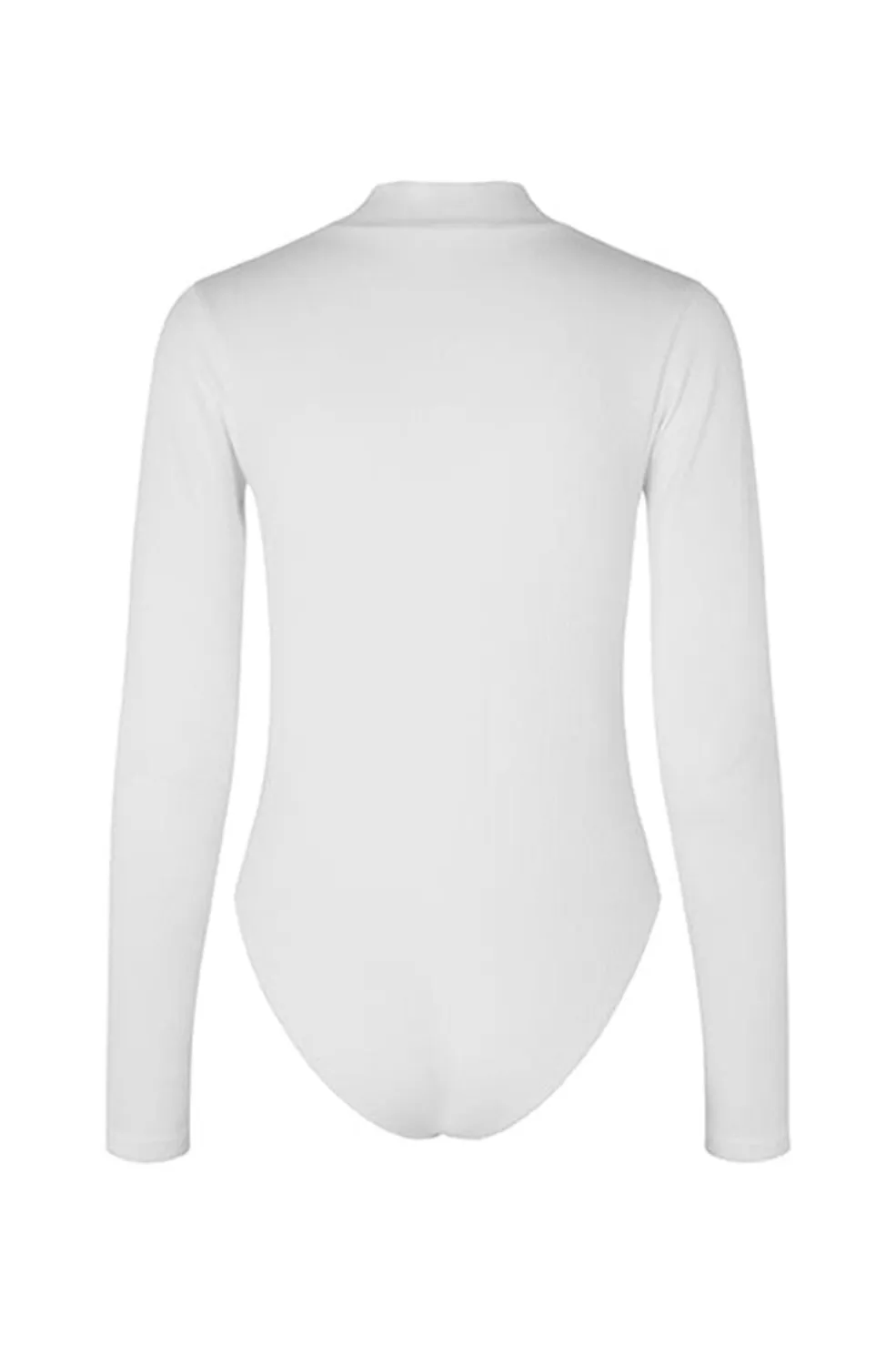 Hvid bodystocking fra Lykkeland Ateliér med høj krave og lange ærmer. Den tætsiddende model har lynlås foran og et højt snit ved både forben og bagben.