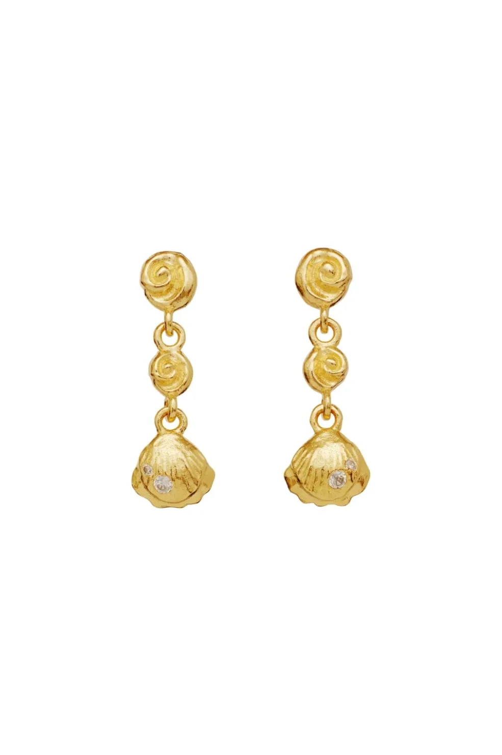 Gyldne øreringe fra Maanesten med skalformet design og spiralmønster. De små zirkonia-sten giver et diskret glimt, og øreringene har maritim inspiration.