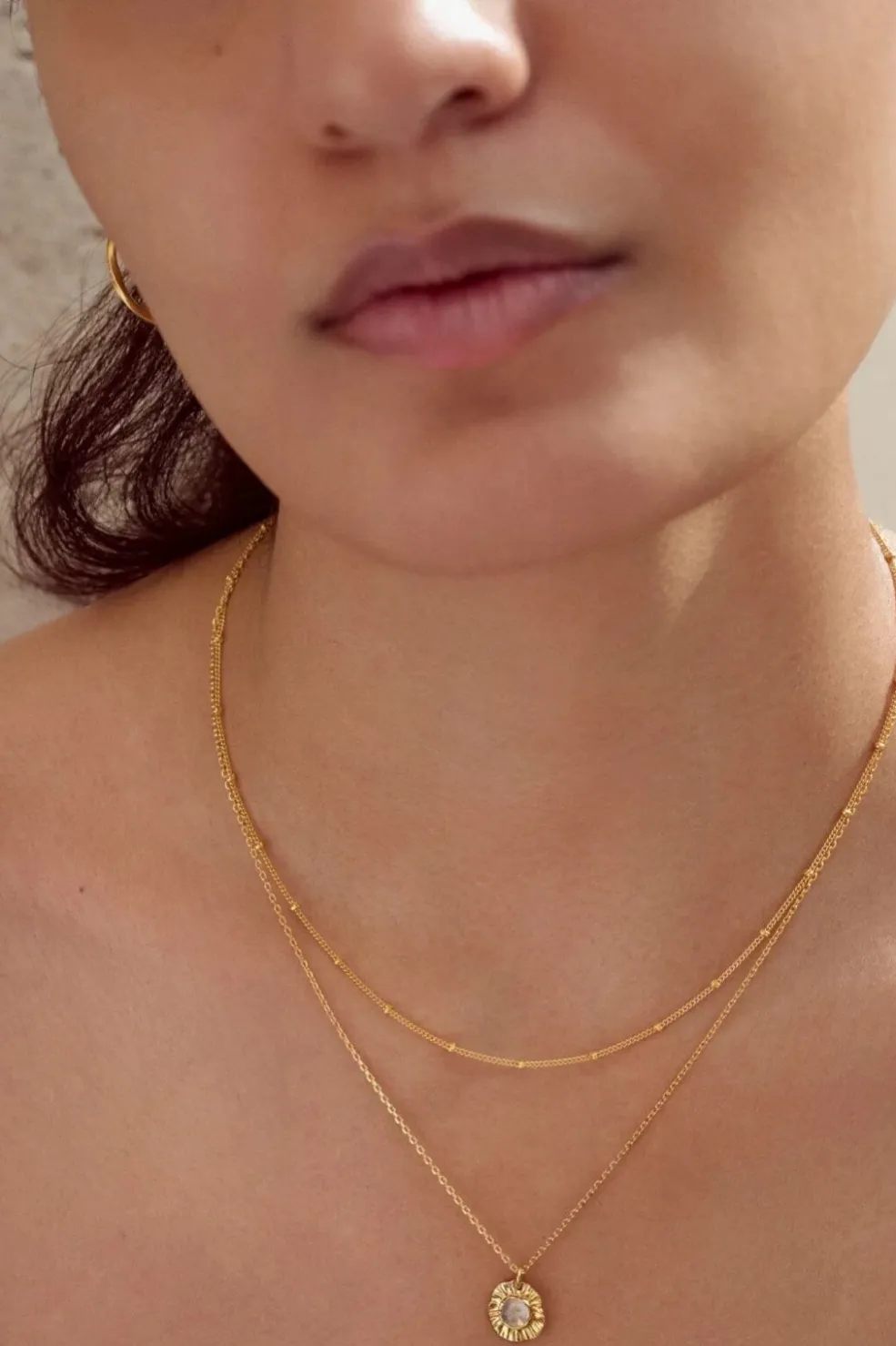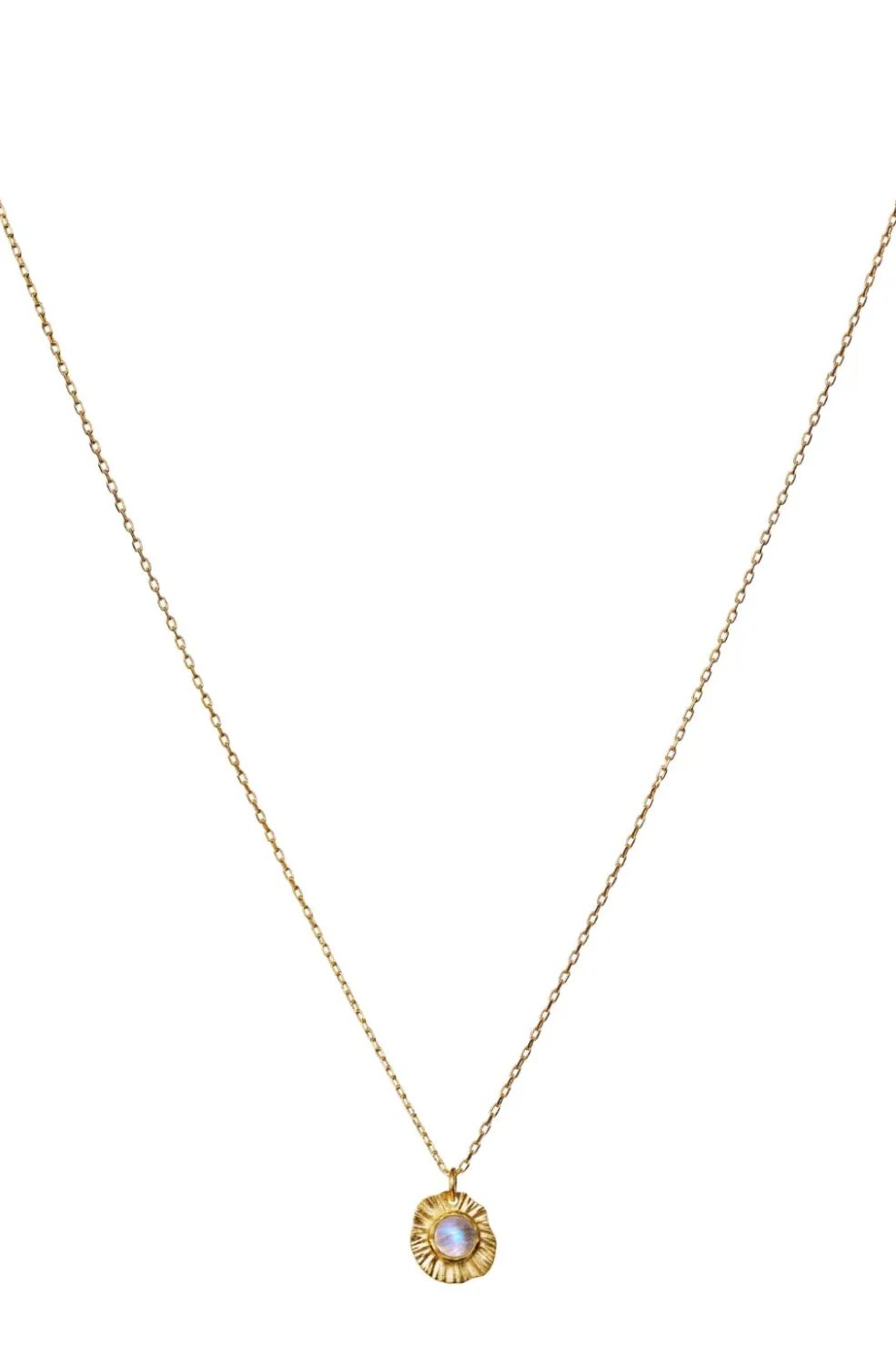 Guldbelagt halskæde fra Maanesten med et rundt vedhæng. Den teksturerede overflade har en indsat sten i midten, og kæden måler 45 cm i længden.