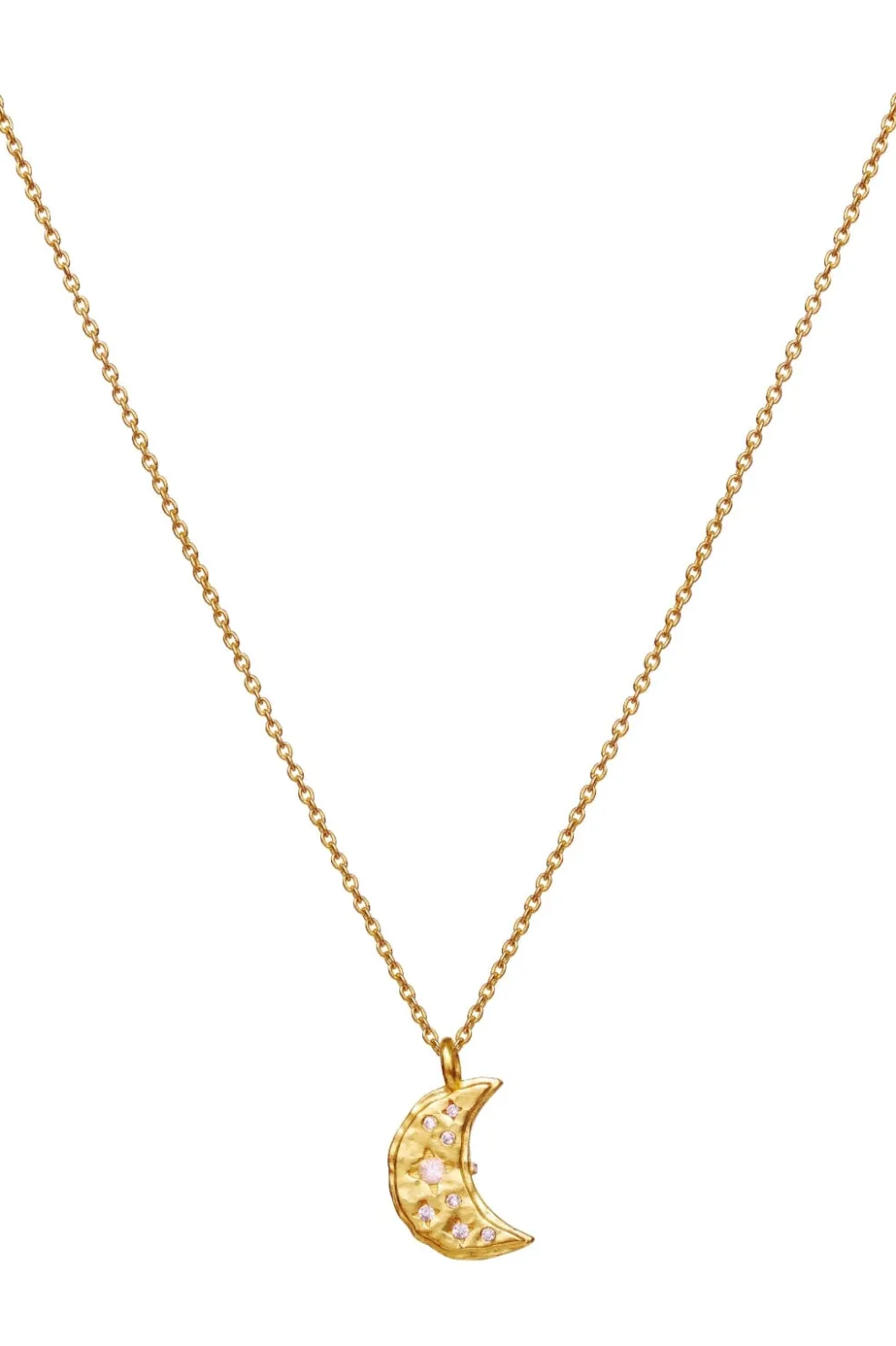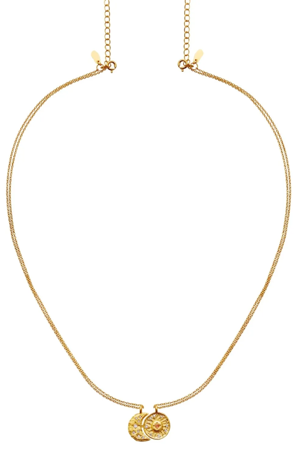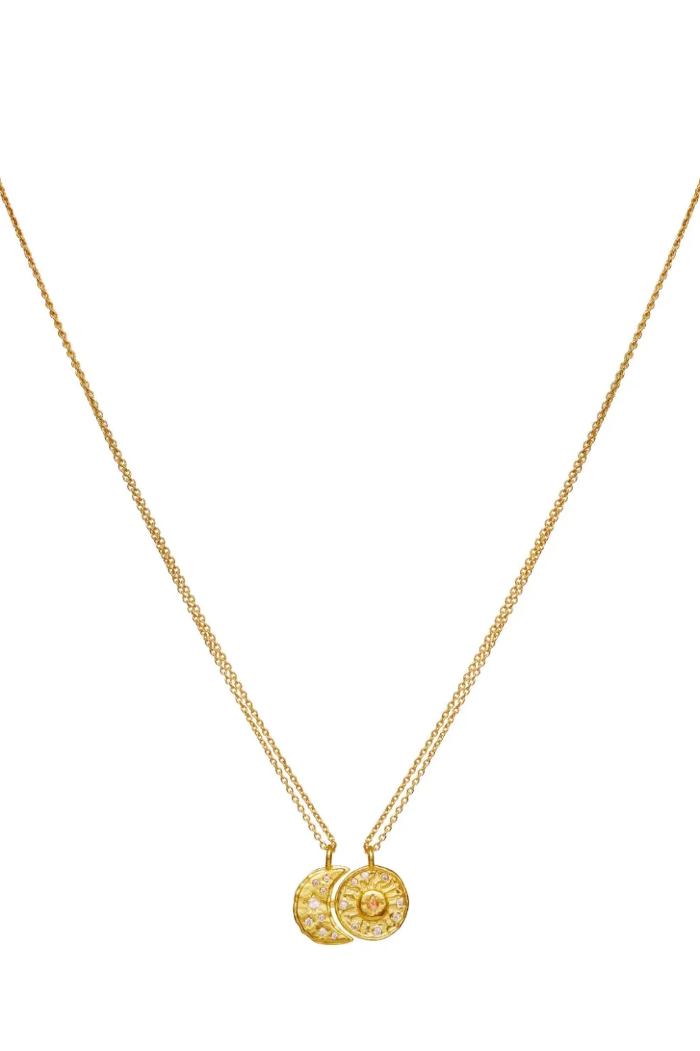 Guldbelagt halskæde fra Maanesten med sol- og månemotiver. Vedhængene er dekoreret med små sten og har et karakteristisk design med himmelske symboler.