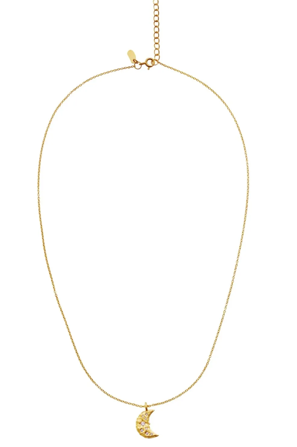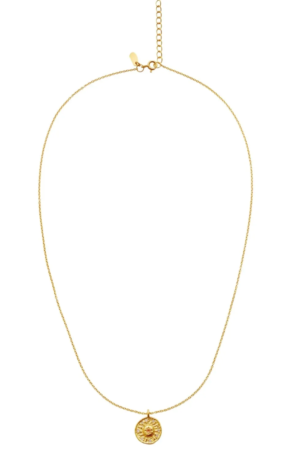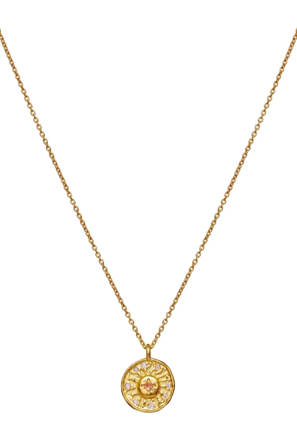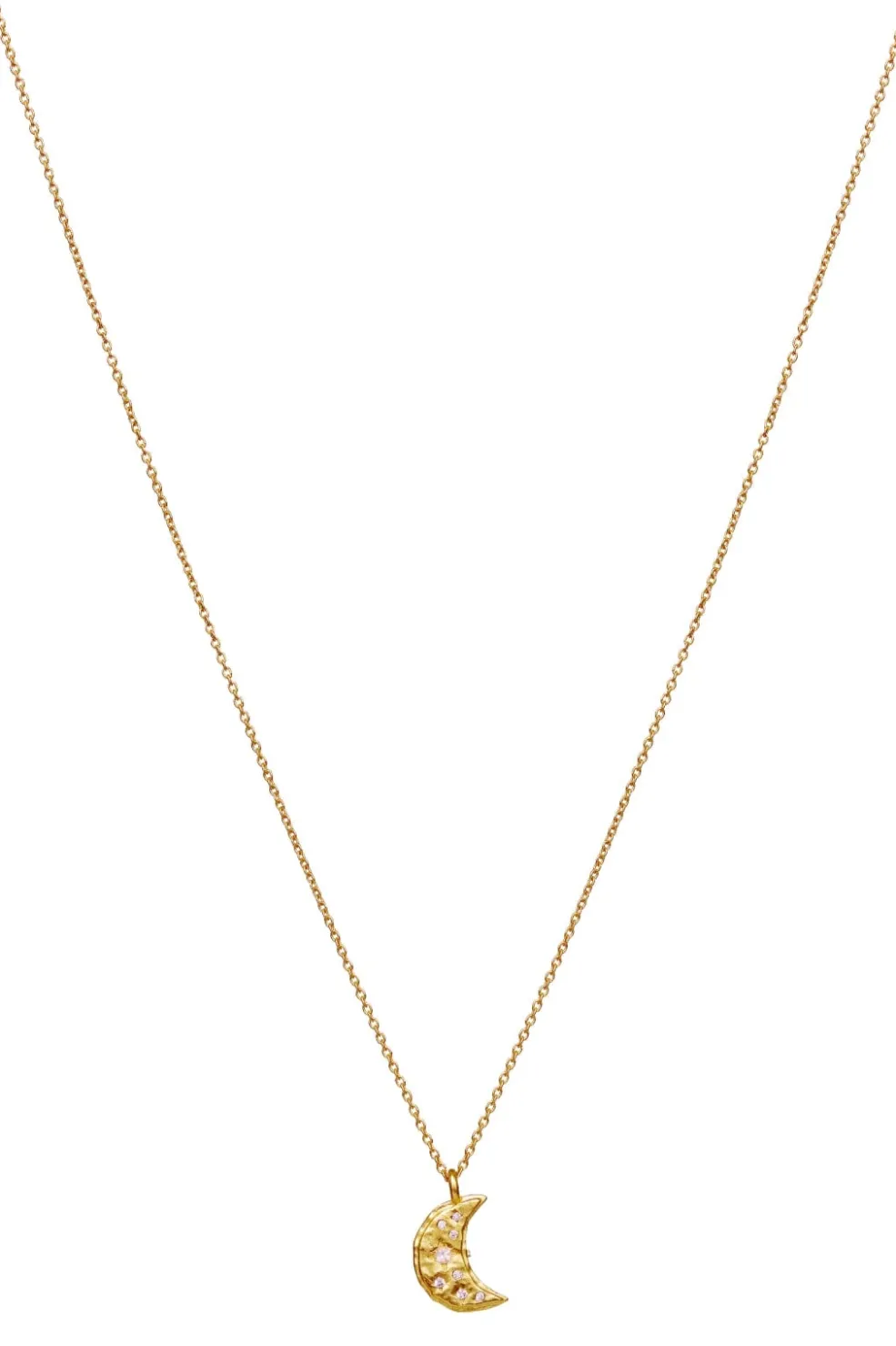 Guldbelagt halskæde fra Maanesten med sol- og månemotiver. Vedhængene er dekoreret med små sten og har et karakteristisk design med himmelske symboler.