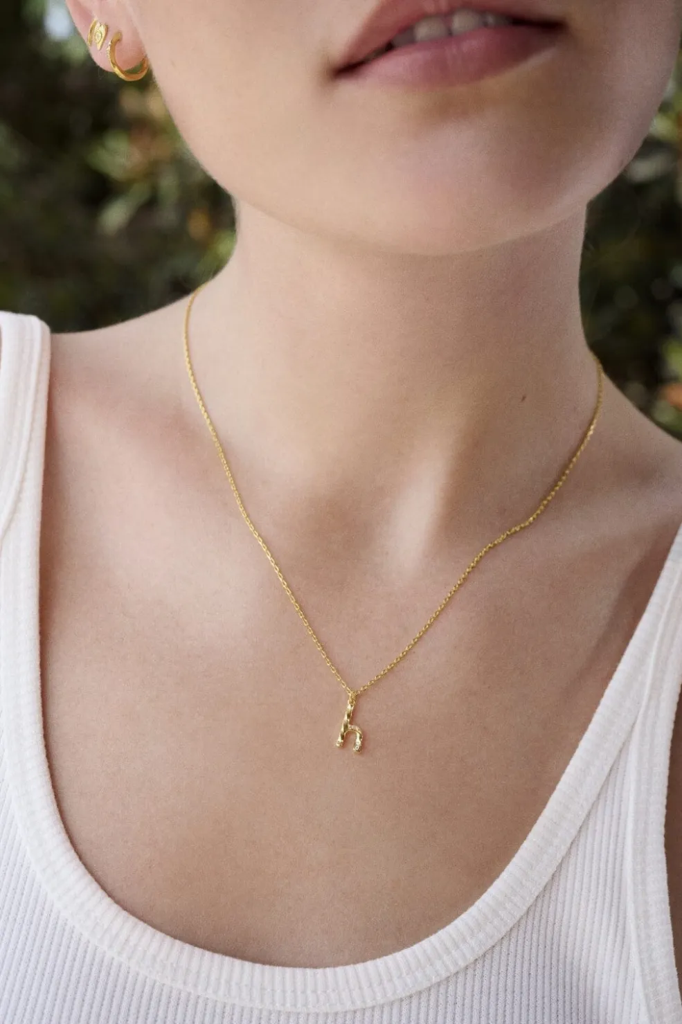 Guldbelagt halskæde fra Maanesten med et h-formet vedhæng. Vedhænget har en struktureret overflade med små dekorative sten og sidder på en fin kæde med linkdesign.
