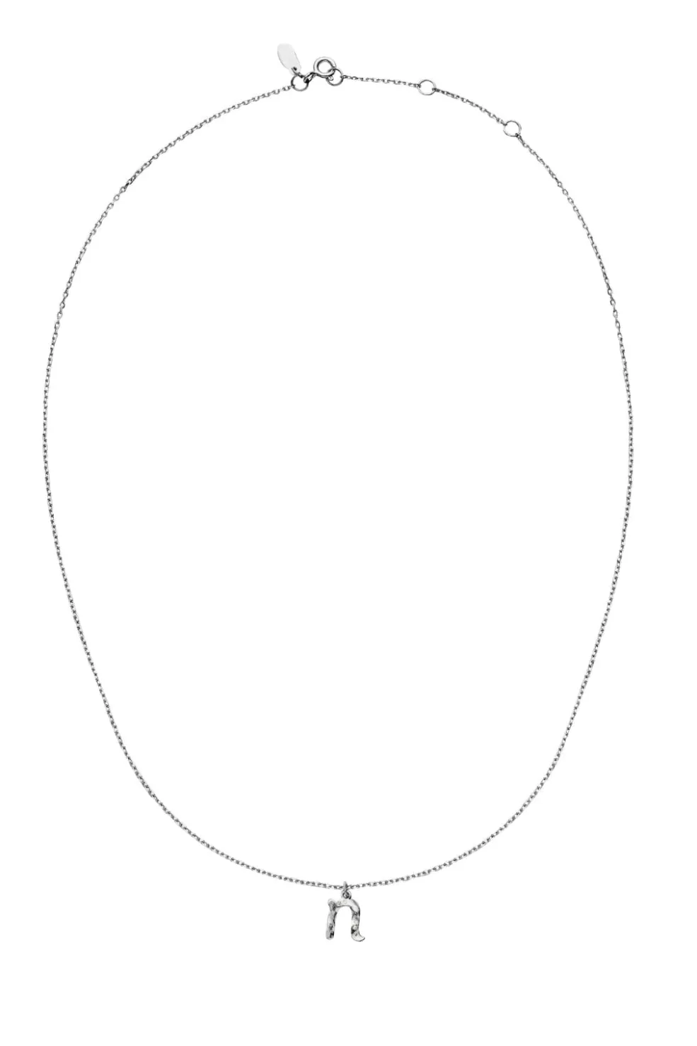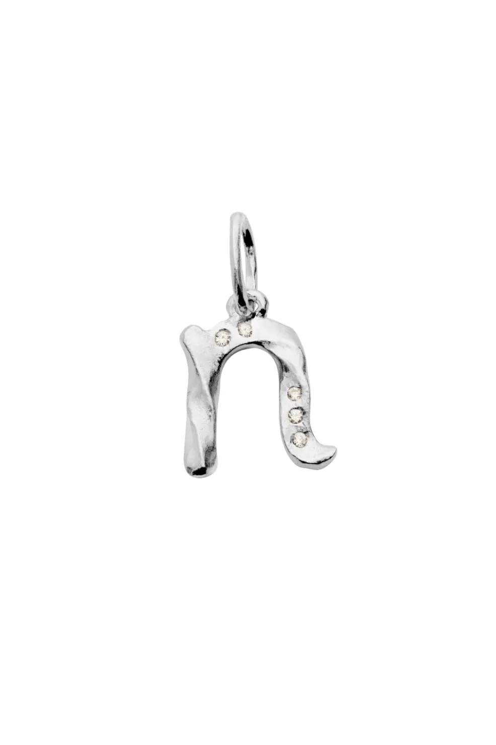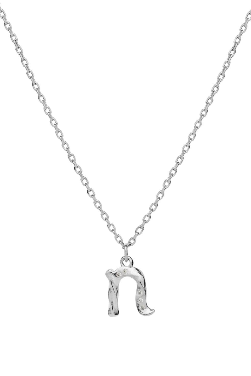 Sølvhalskæde fra Maanesten med et bogstavsvedhæng i genanvendt sterlingsølv. Vedhænget har form som et ‘n’ og er prydet med små sten, der skaber fine detaljer i designet.