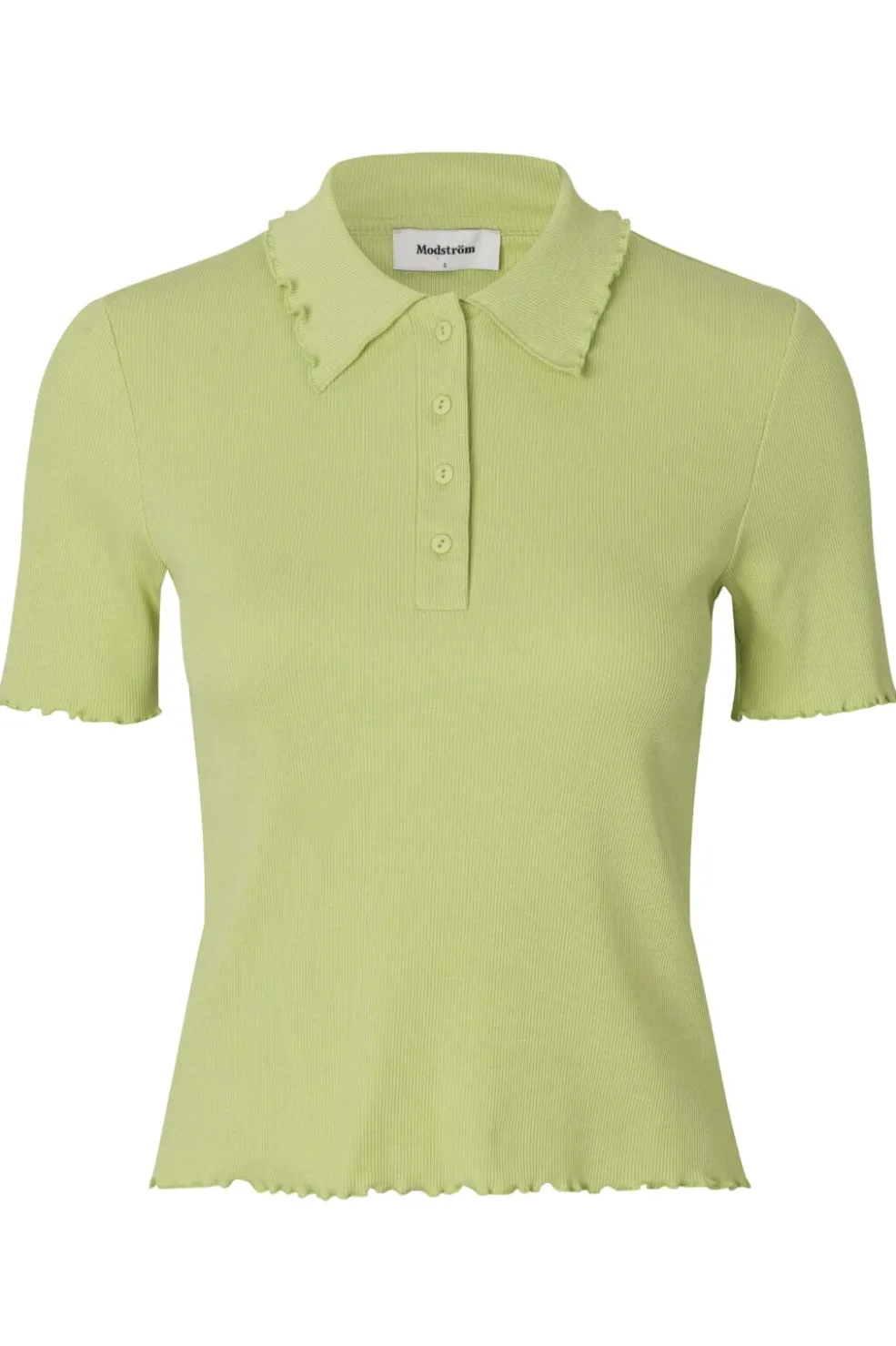 Lys grøn polo fra Modström med rynkede kanter ved kraven og ærmerne. Den figursyede jersey-polo har en klassisk knaplukning og korte ærmer med overlockede kanter.