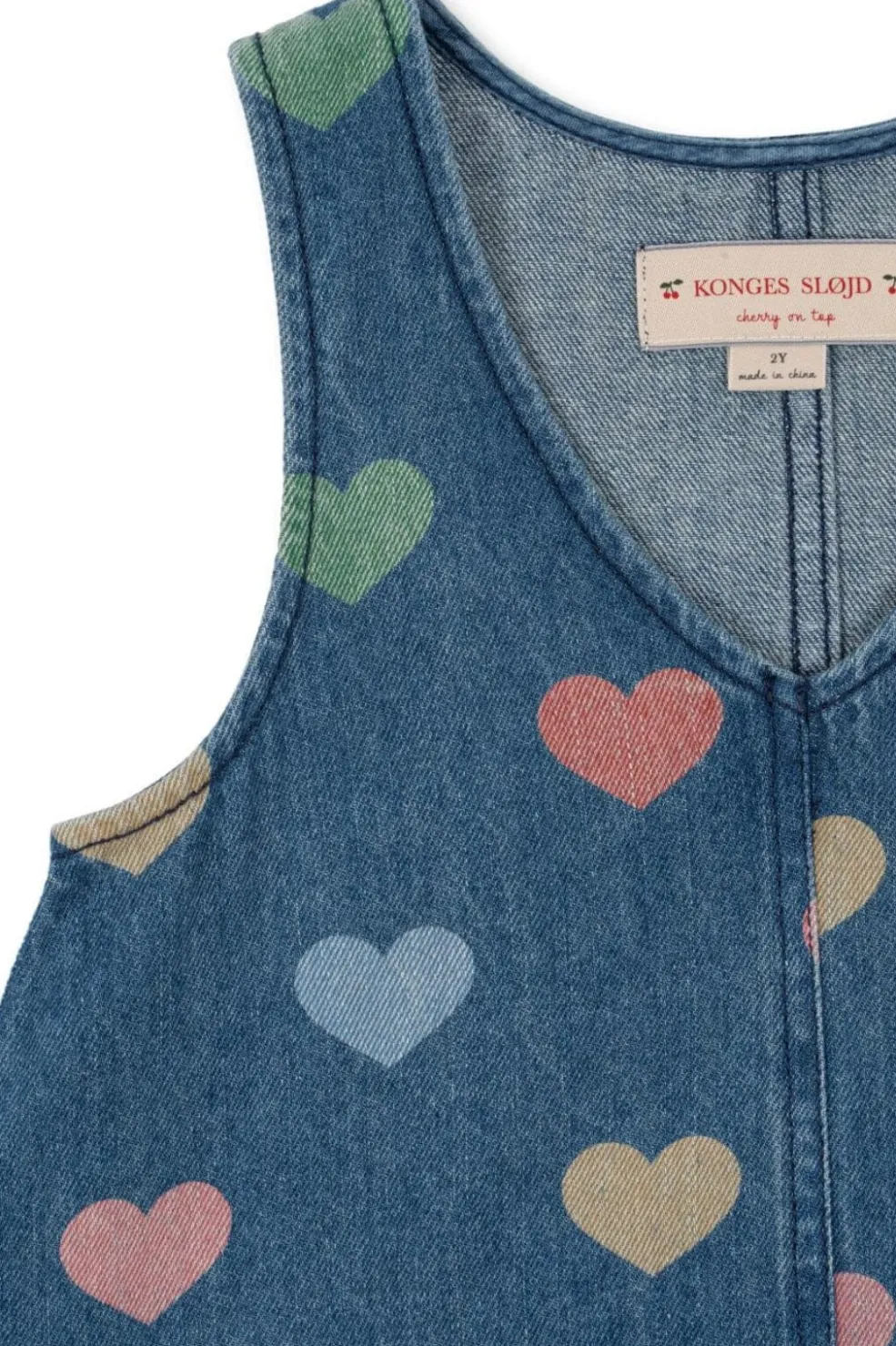 Kjole fra Konges Sløjd, lavet af 100 % økologisk bomuld. Det flerfarvede hjerteprint på blå baggrund giver kjolen et charmerende udtryk.