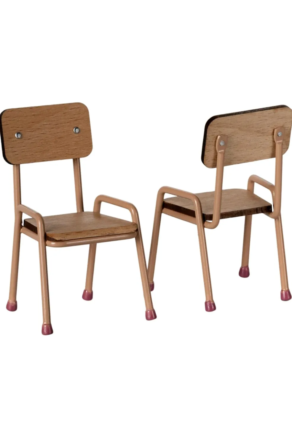 Bord og stole fra Maileg i bøgetræ og metal. Møblerne har pink ben og passer til Maileg-musene. Bordet og stolene er lavet af holdbare materialer med håndmalede detaljer.