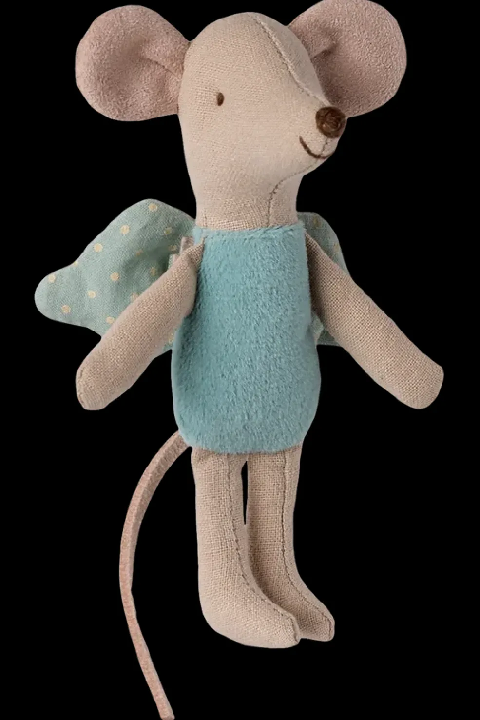 En fe-mus fra Maileg med en lyseblå dragt og mintgrønne vinger med prikker. Musen har en lang hale og en lille snude.