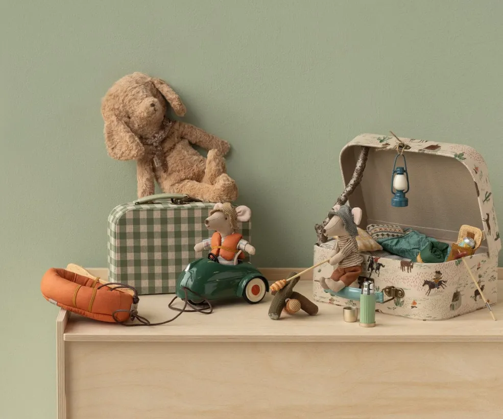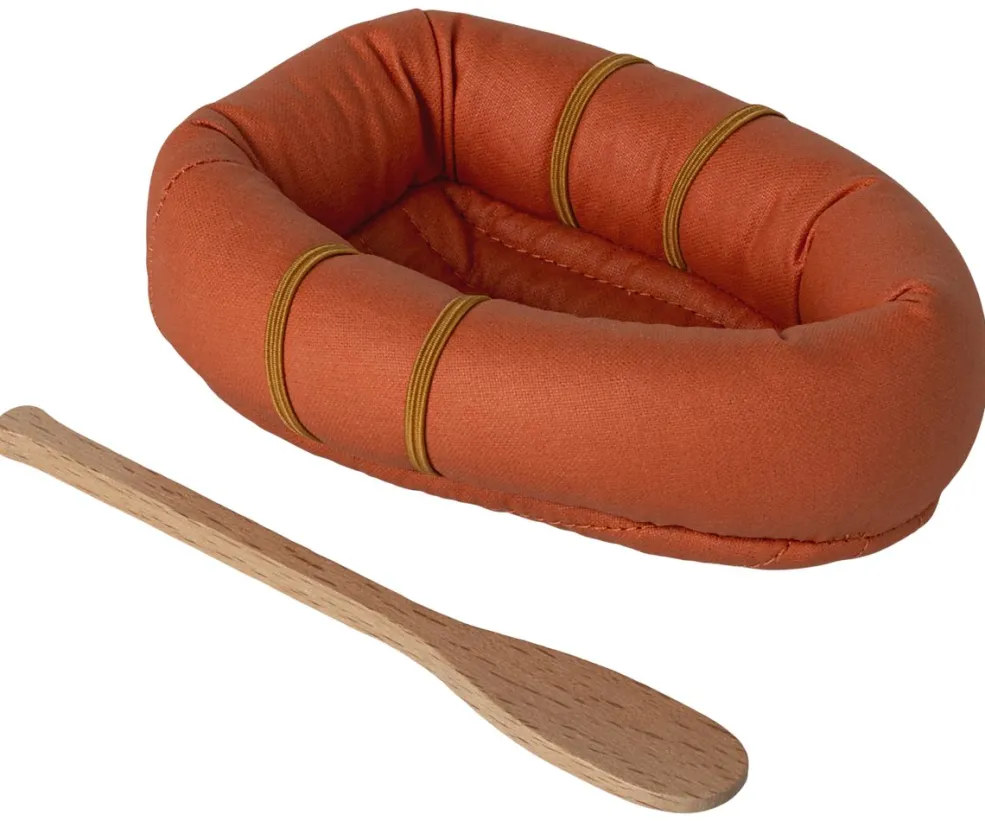 En gummibåd fra Maileg, designet som tilbehør til Maileg-mus. Båden er lavet af stof og inkluderer en lille åre af træ.