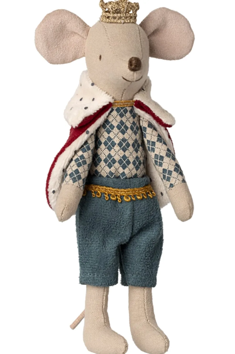 En kongemus fra Maileg med en hvid kappe med rød foring og en lille krone på hovedet. Musen har en mønstret bluse med diamantdesign.
