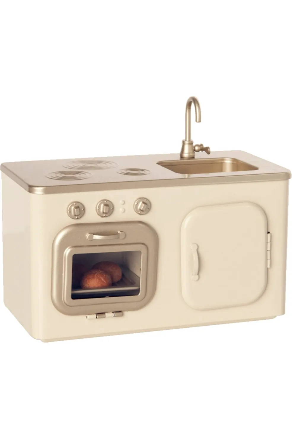 Et miniaturekøkken fra Maileg med kogeplader, ovn og vask. Det cremehvide design med gyldne detaljer er lavet til fantasifuld leg i børnehøjde.