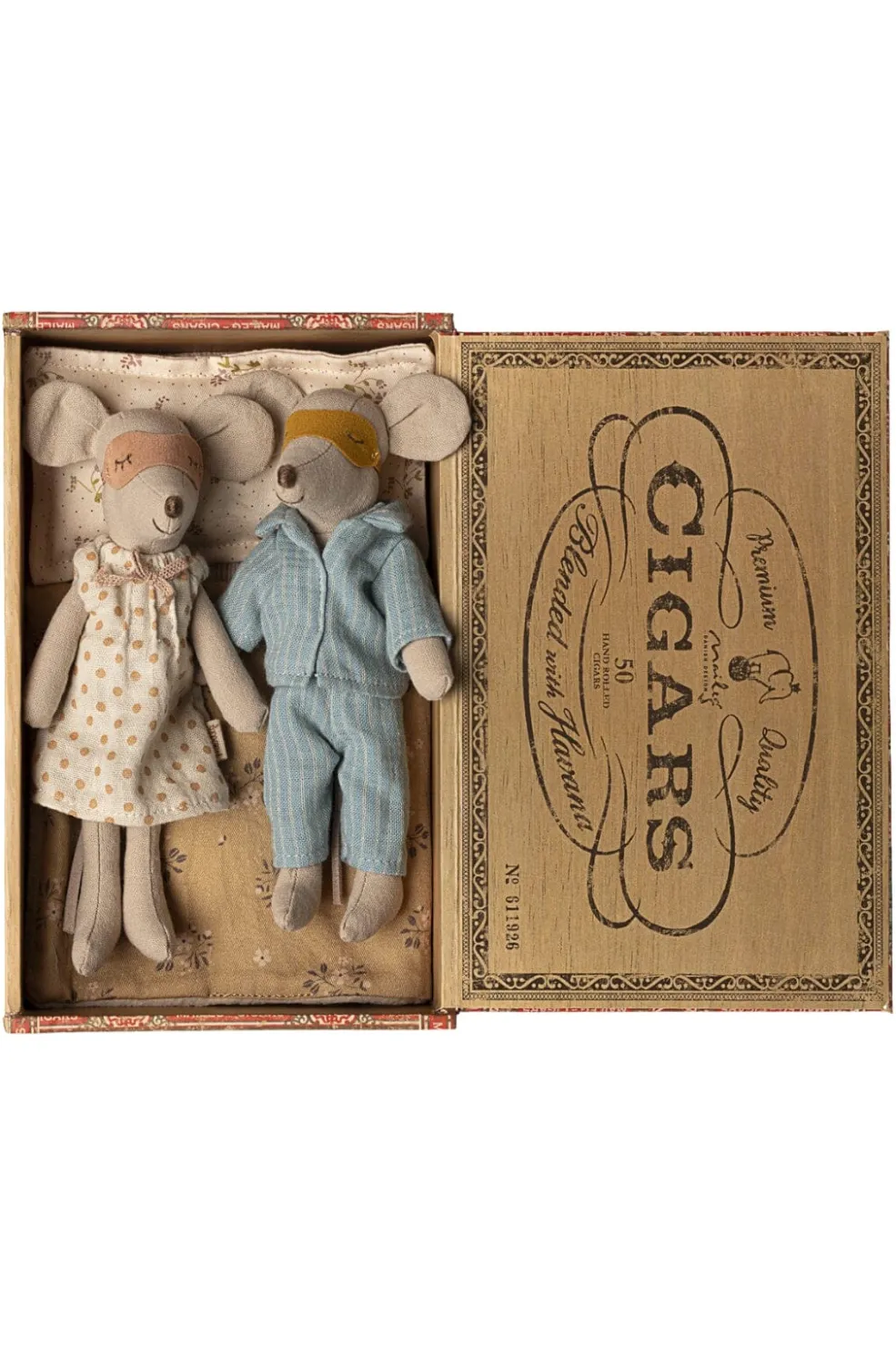 To mus i cigarkasse fra Maileg. Den ene mus har en prikket kjole på, og den anden har en stribet pyjamas.