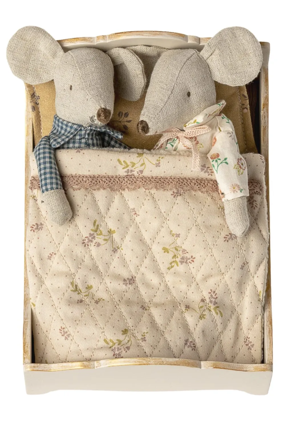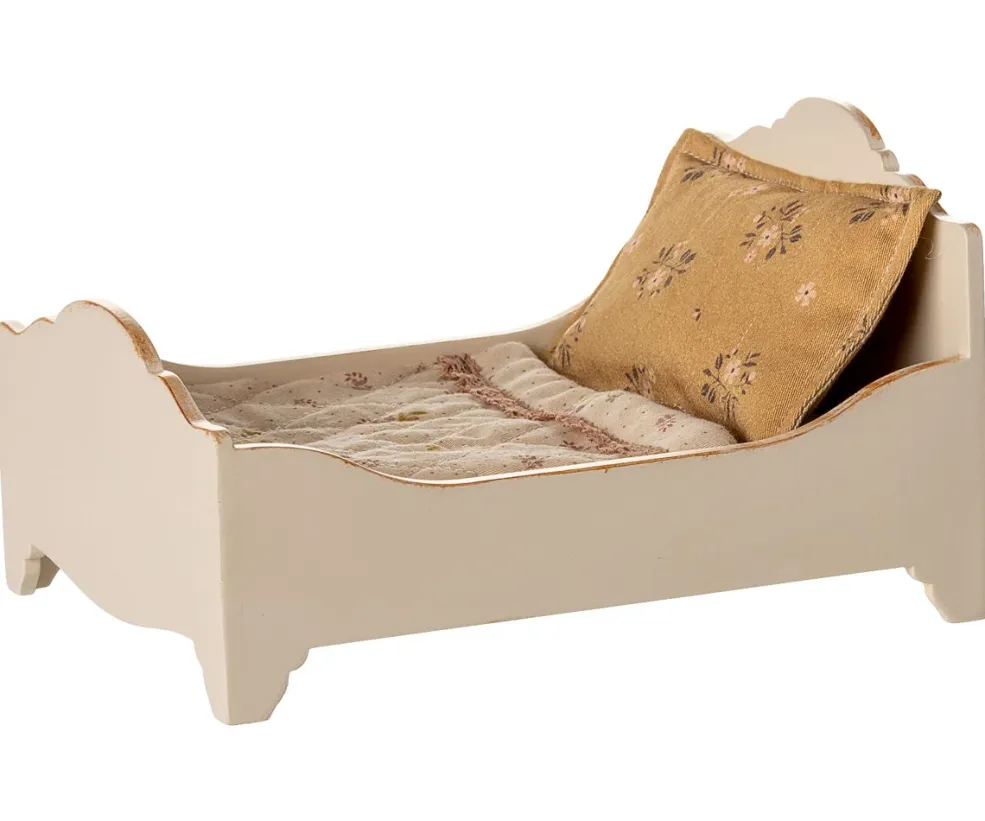En lille træseng fra Maileg, designet til små musefigurer. Sengen har en gylden finish på træet og kommer med sengelinned i bomuld.