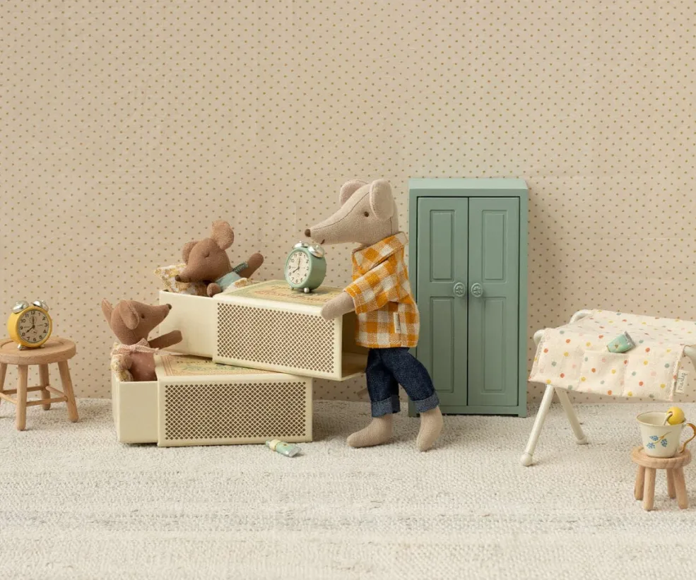 Tændstikæsken fungerer som musens seng og har trykt tekst og mønster på ydersiden. Æsken kan åbnes og lukkes for at tage musen ud.
