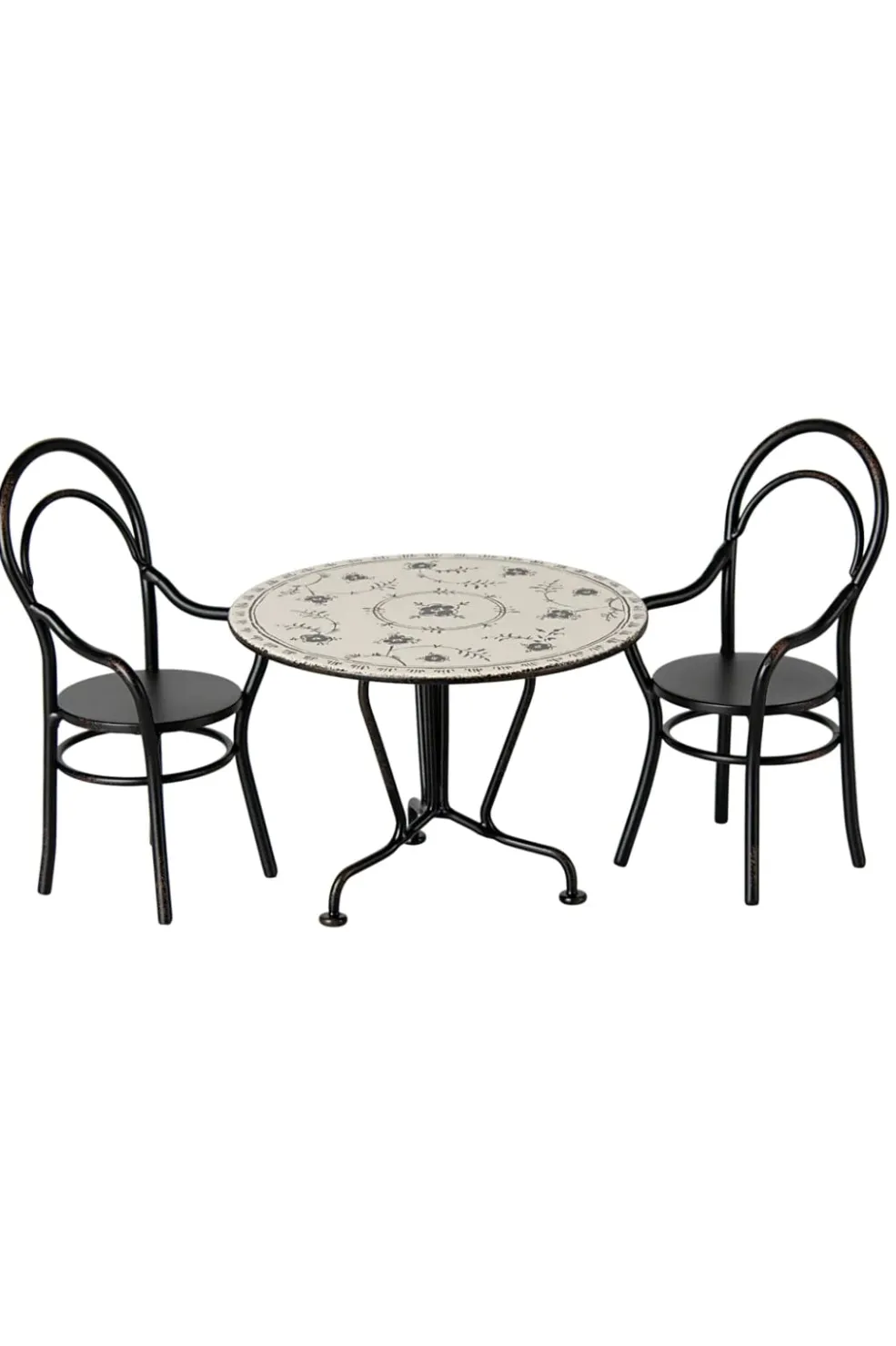 Sort spisebord med to stole i metal fra Maileg. Møblerne passer til dukkehuset og er designet til Teddy-familien. Bordet har en rund plade med et dekorativt mønster.