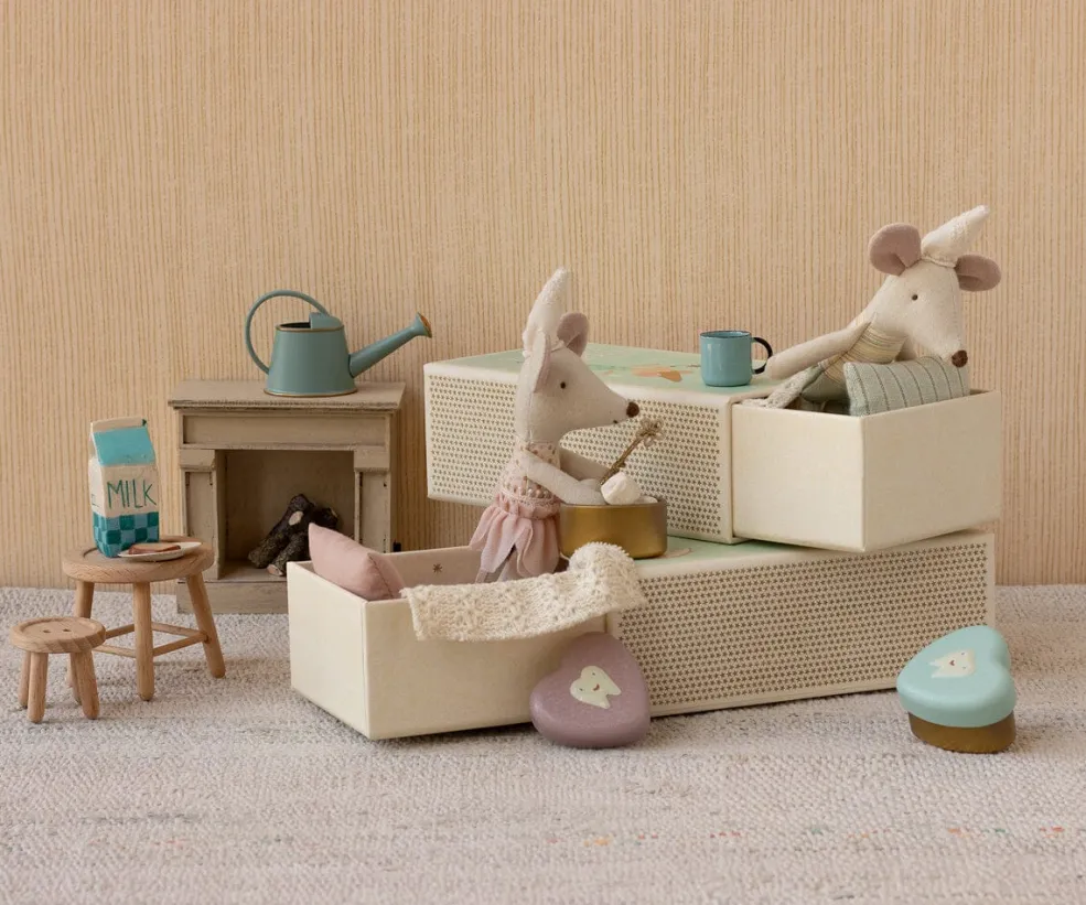 Musen ligger i en tændstikæske med pude og tæppe, der giver en blød base til opbevaring af tænder under puden.