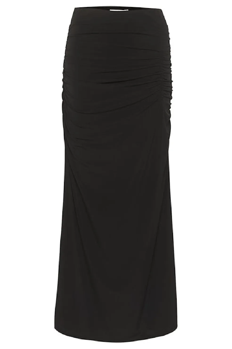 Sort nederdel fra Gestuz i ankellængde med flæsedetaljer. Den har en regular pasform med elastik i taljen og kan styles til både hverdag og fest.