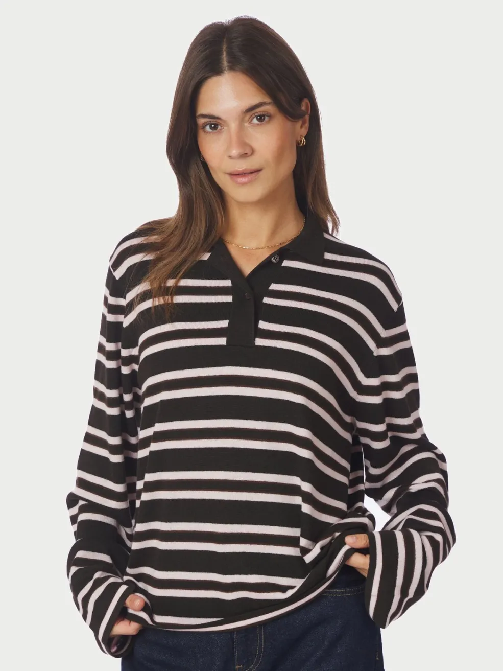 Mørkebrun strikbluse fra Neo Noir med vandrette striber i hvid. Blusen har en polo-krave med knaplukning og lange ærmer.