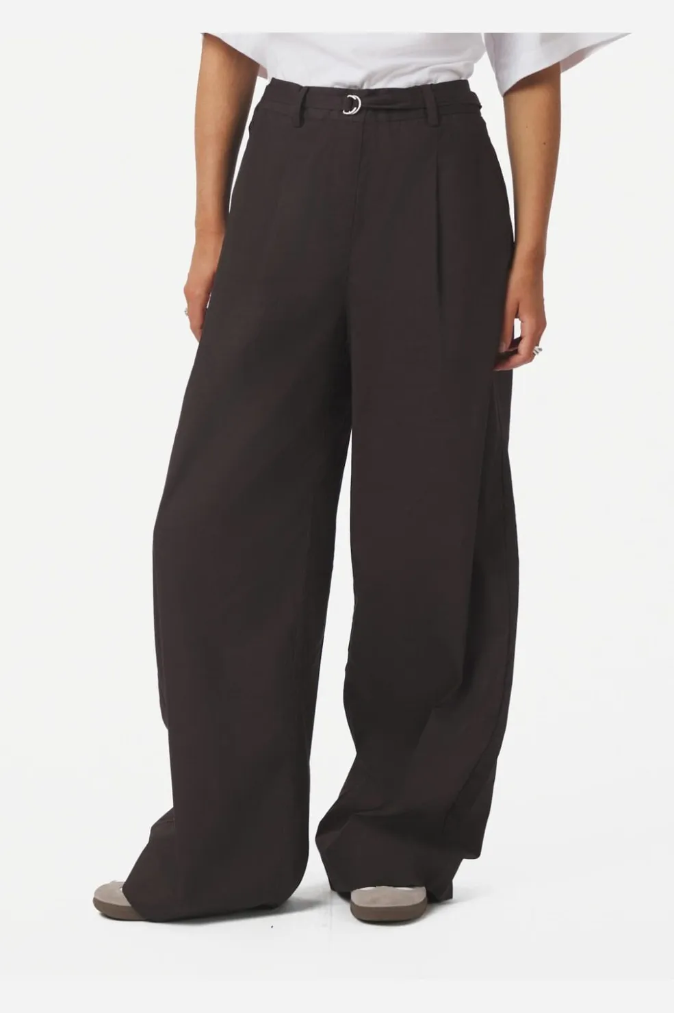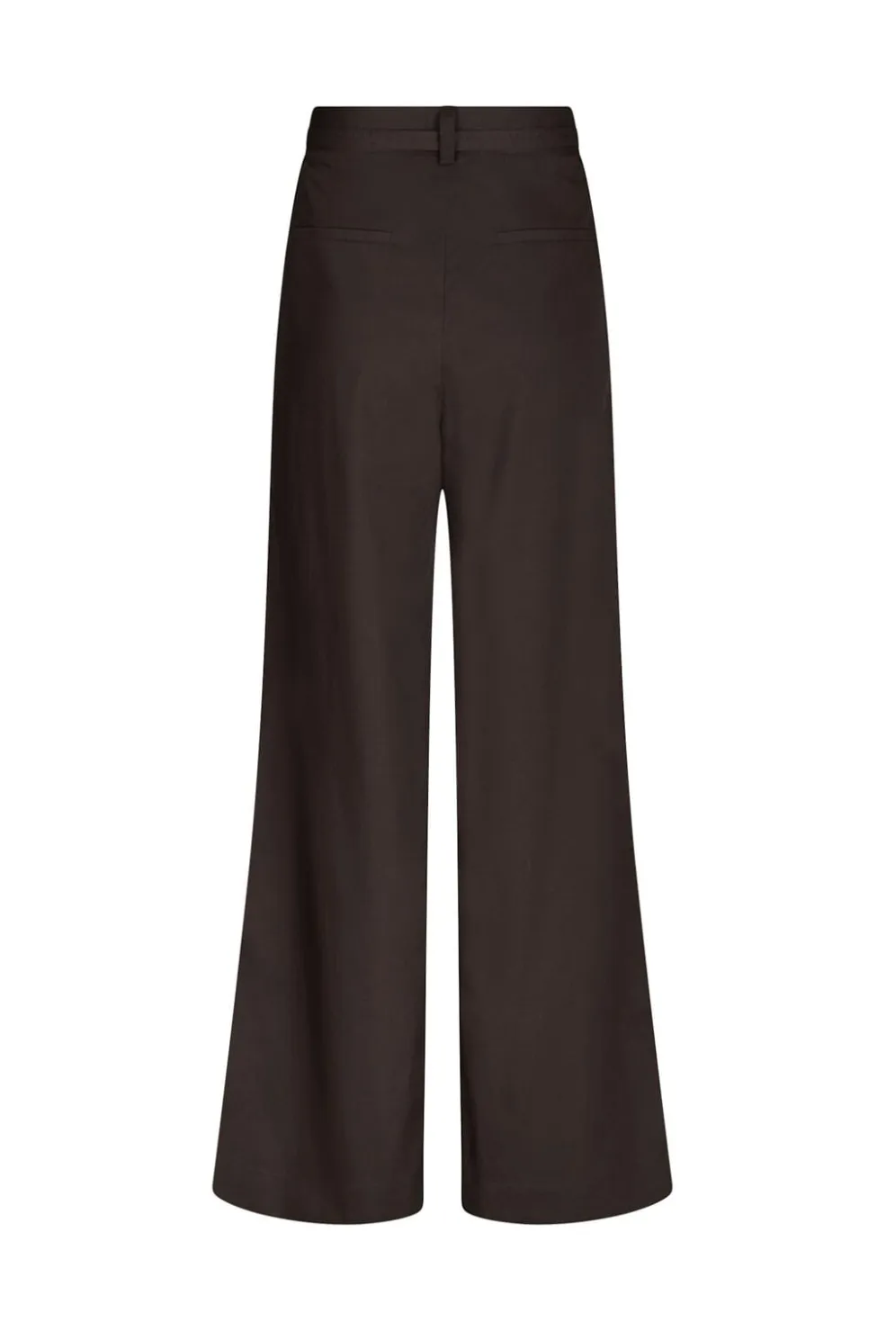 Mørkebrune poplinbukser fra Neo Noir med vid benvidde og pressefolder. Bukserne har en høj talje og går helt ned til gulvet.
