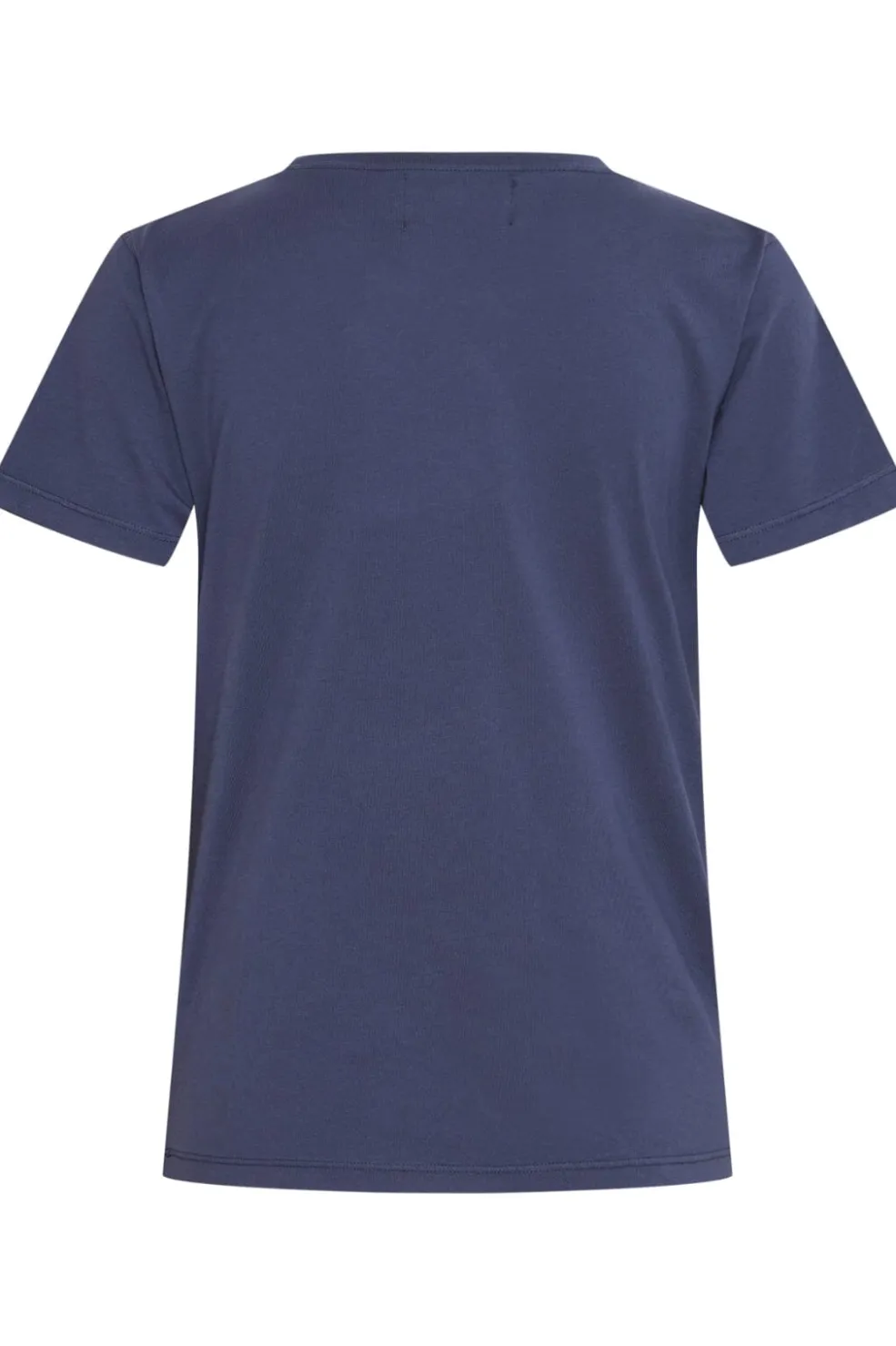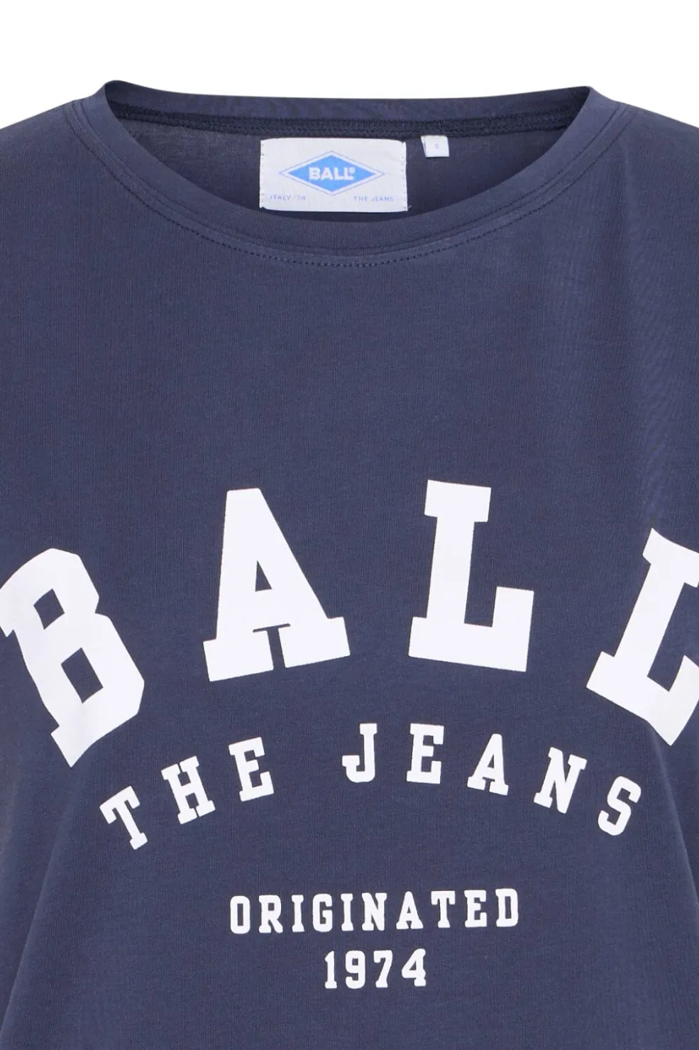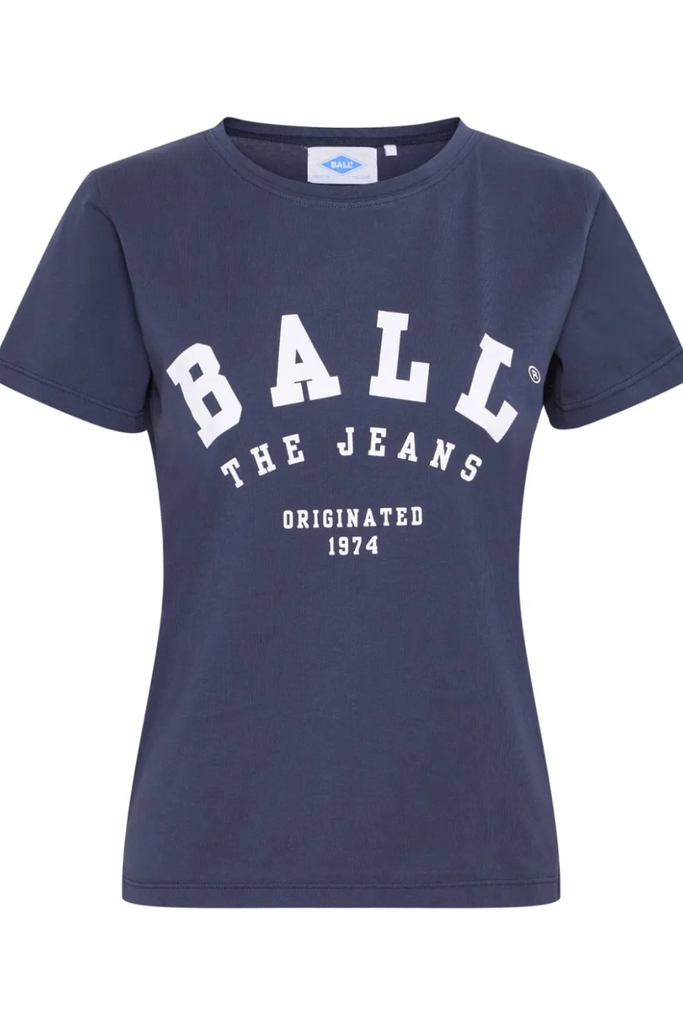 Mørkeblå t-shirt fra Ball med hvidt logo på forsiden. T-shirten har en klassisk rund halsudskæring og korte ærmer med en regular fit-pasform.