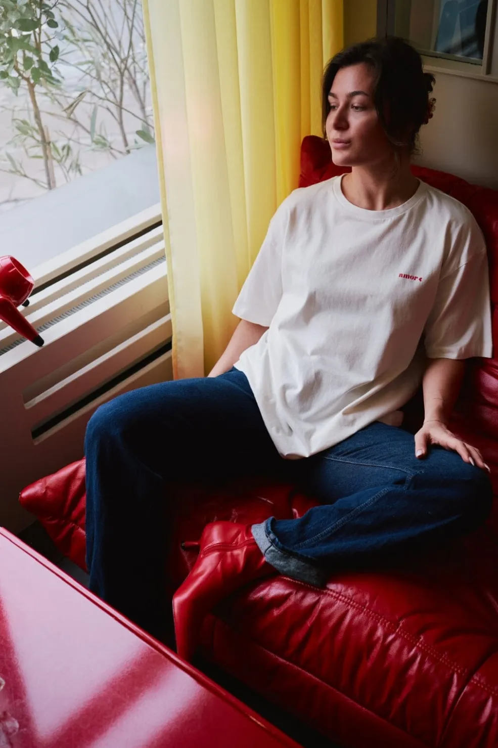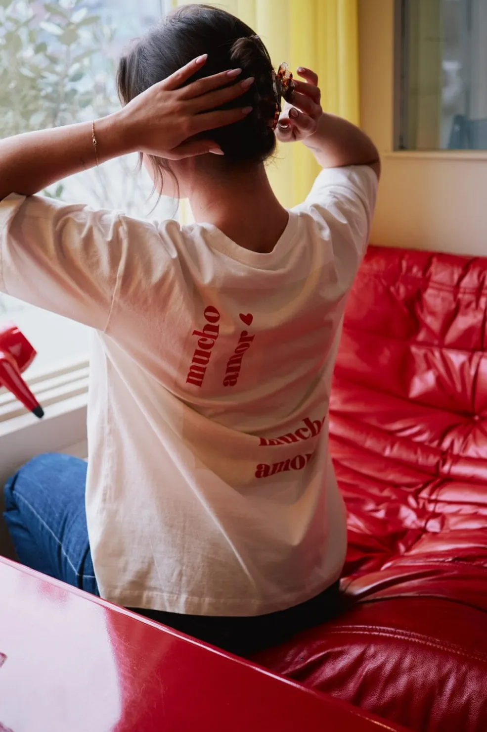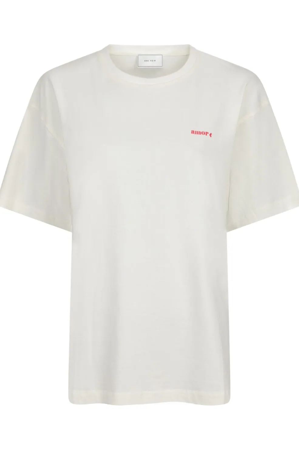 Hvid t-shirt fra Neo Noir med rød broderet tekst. På forsiden står amor diskret broderet, mens bagsiden har et større mucho amor-design. T-shirten har en almindelig pasform.