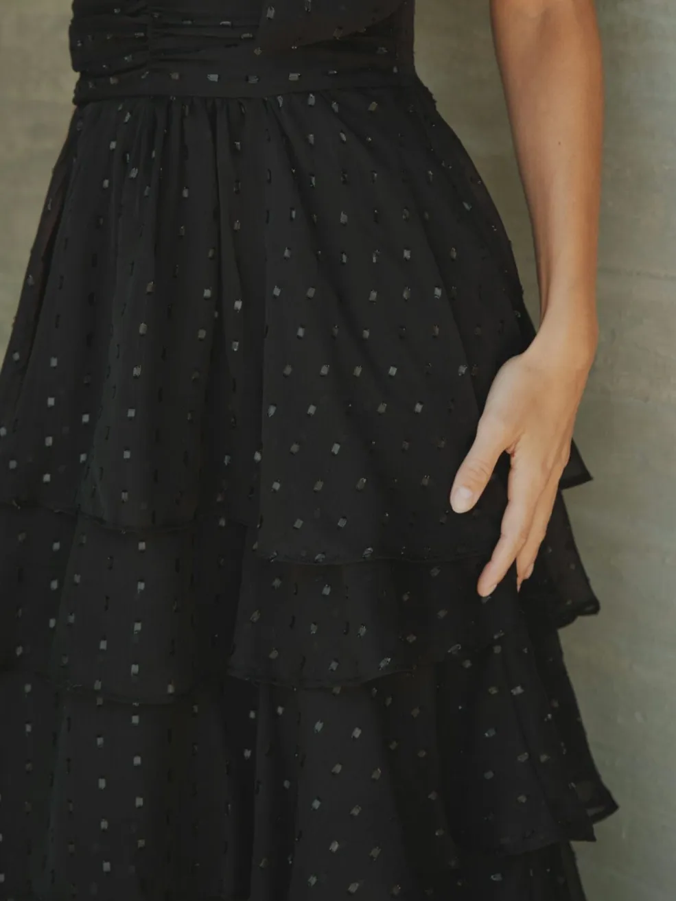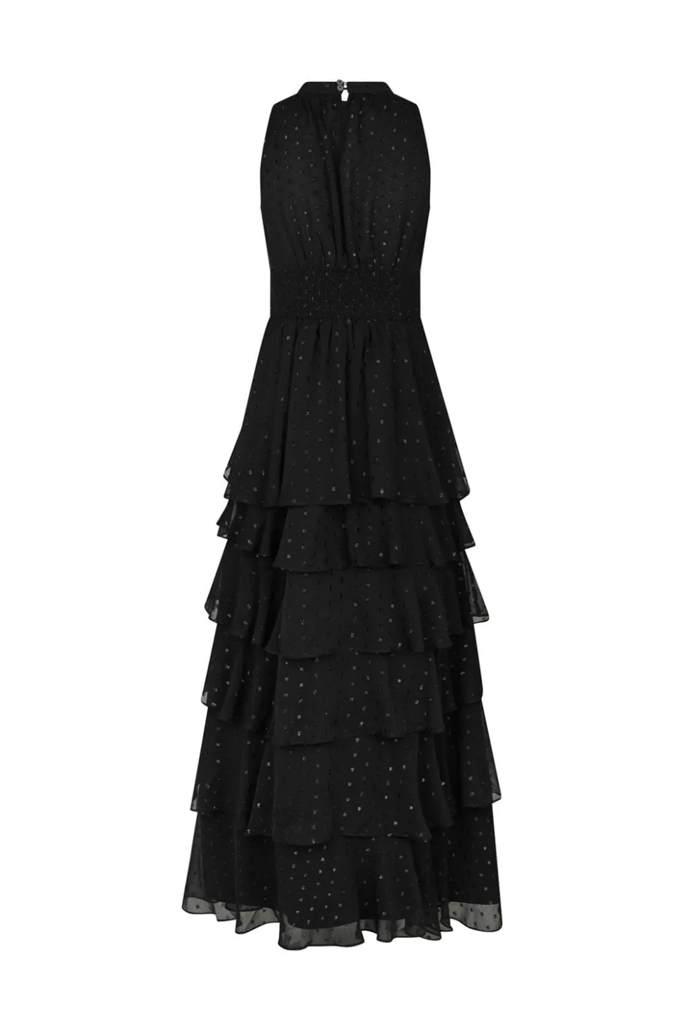 Sort lang kjole fra Neo Noir i chiffon-kvalitet med prikket mønster. Kjolen har høj hals med sløjfe og er bygget op i flere lag stof med flæser.