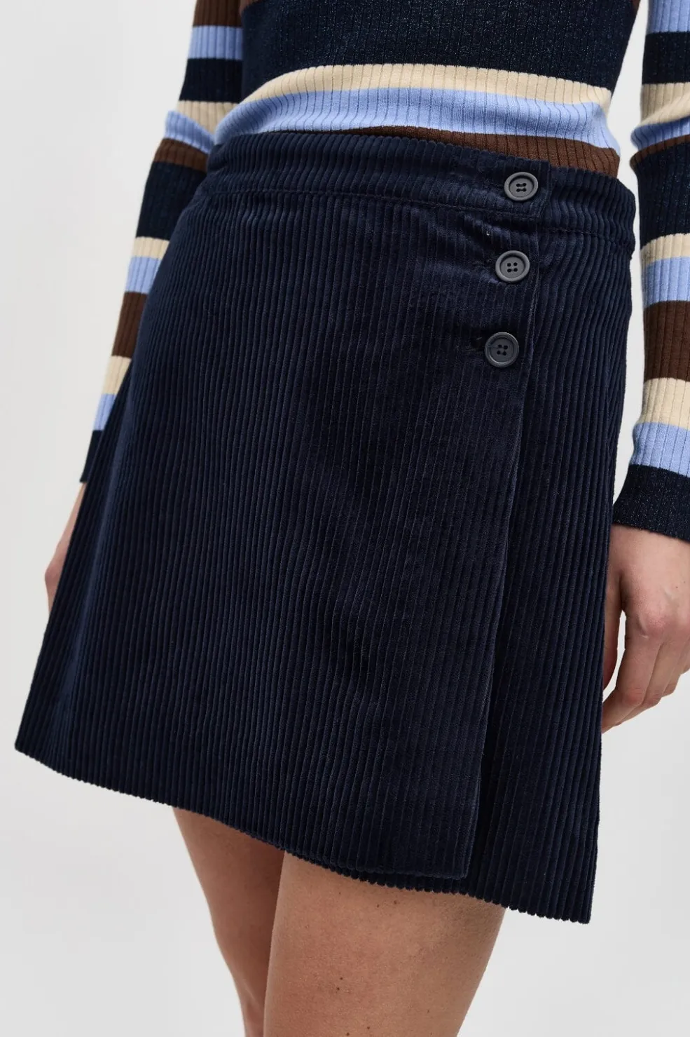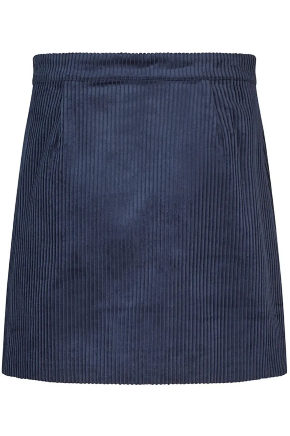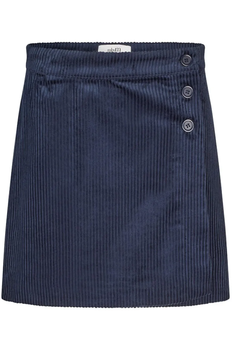 Mørkeblå nederdel fra MbyM med A-linjeform og ribbet tekstur. Den har knapper i siden og er lavet af fløjlsagtigt materiale med en fast struktur.