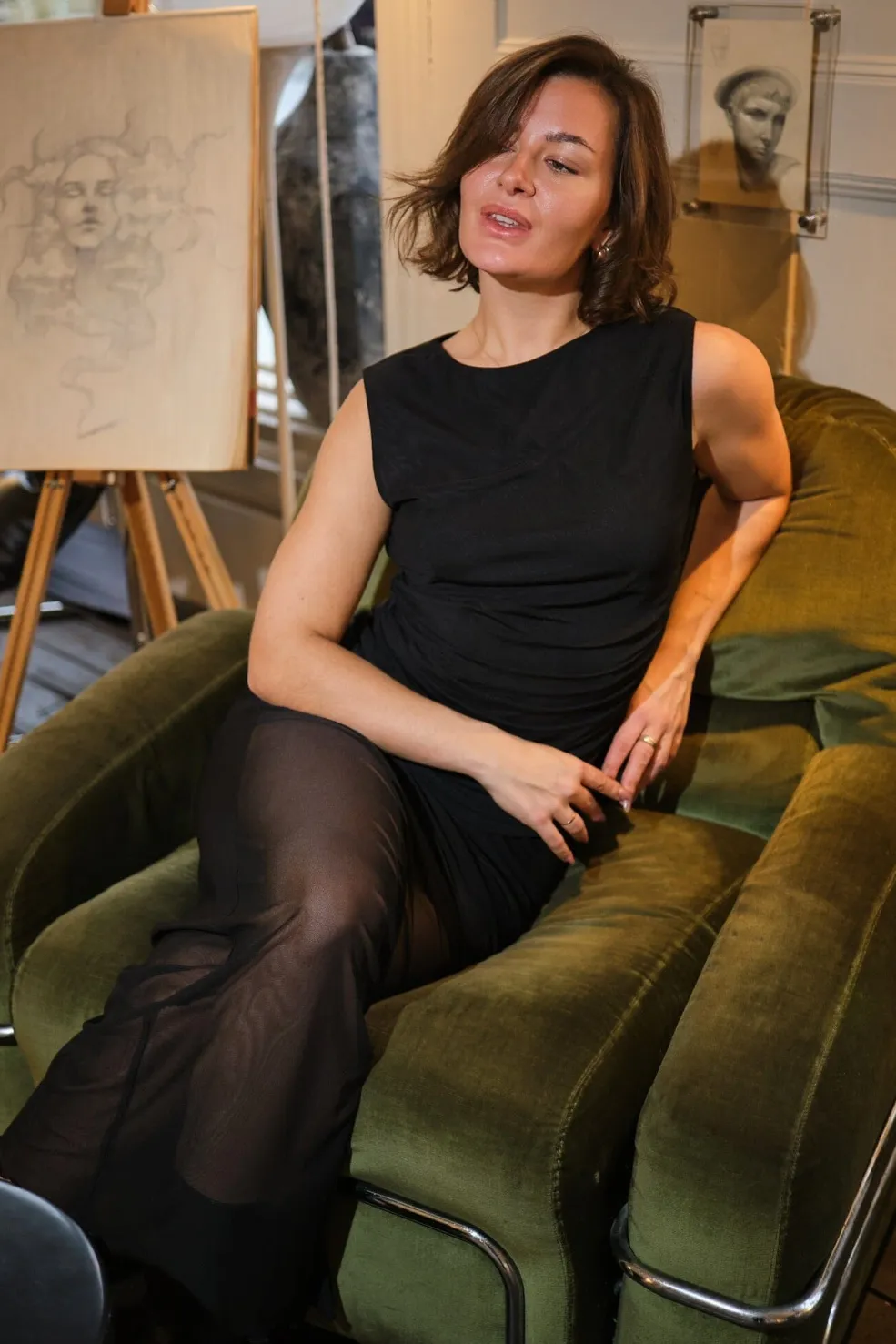 - Modellen er 176 cm høj og bærer størrelse 36
