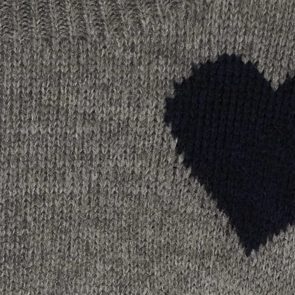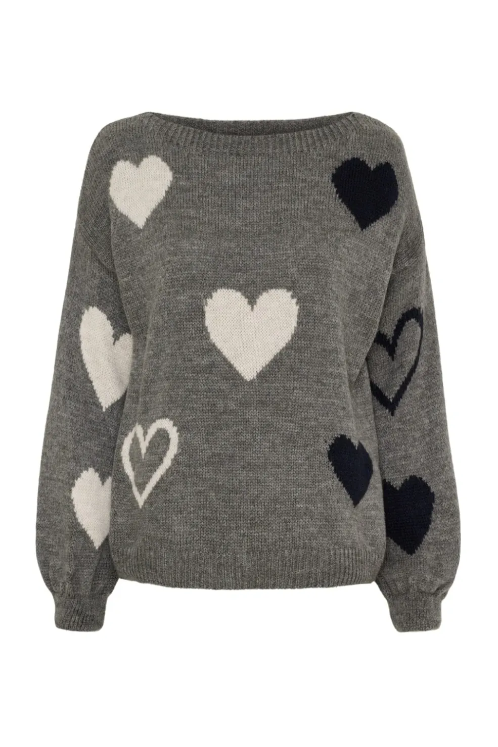 Mørkegrå strik fra Marta Du Chateau med mørkeblå og hvide hjerter. Sweateren har en ribstrikket kant ved halsudskæringen og lange ærmer til de kølige dage.