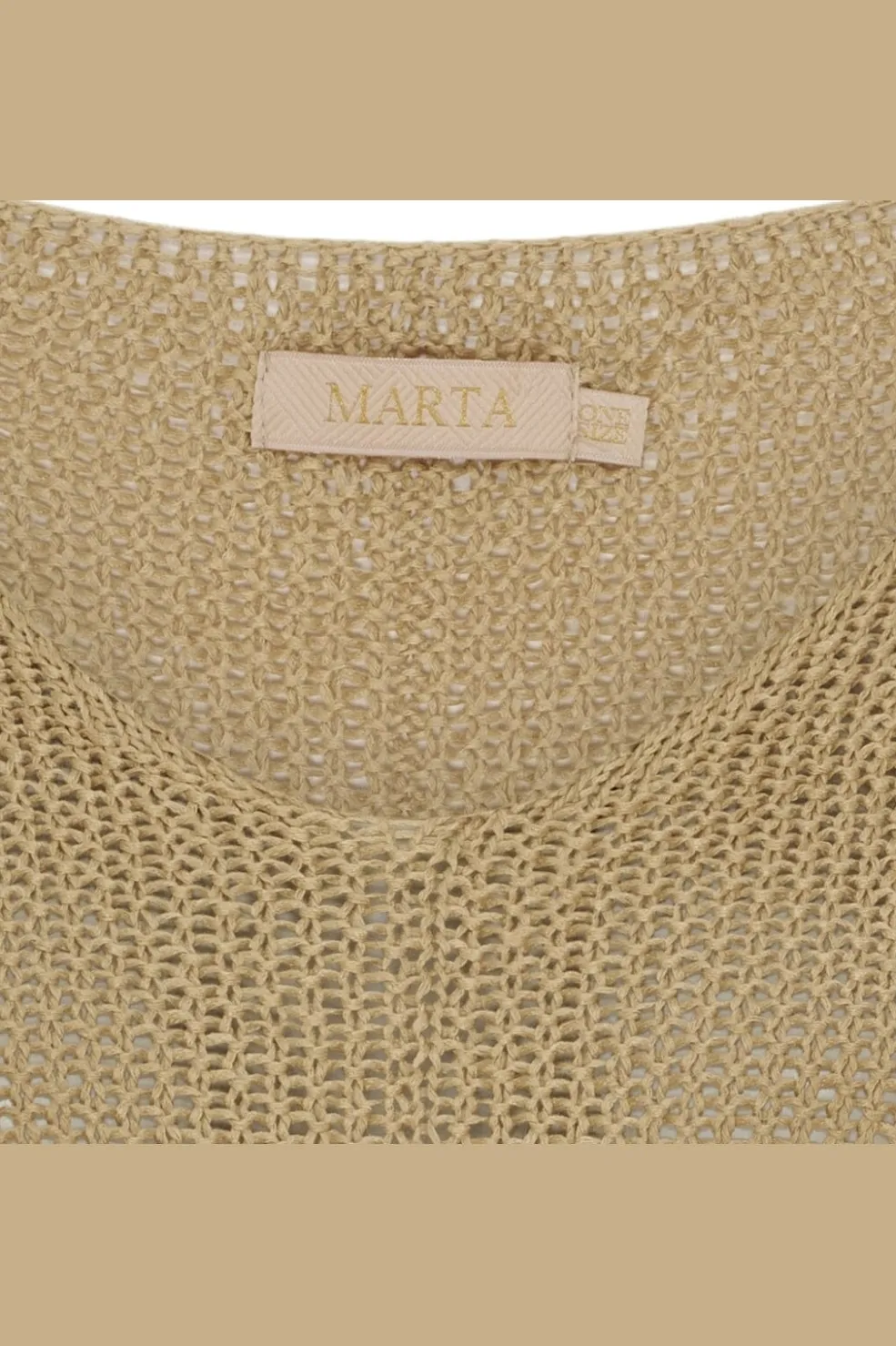 Strikket trøje fra Marta Du Chateau i kamelbrun farve. Den løse strik har en V-halsudskæring og trekvartlange ærmer.