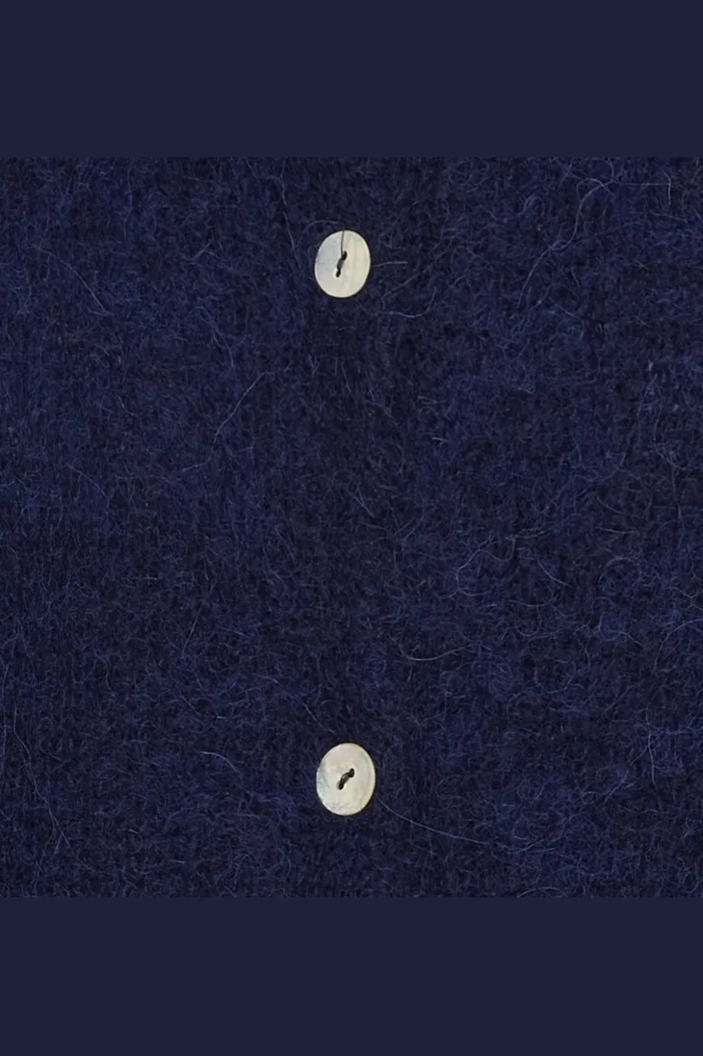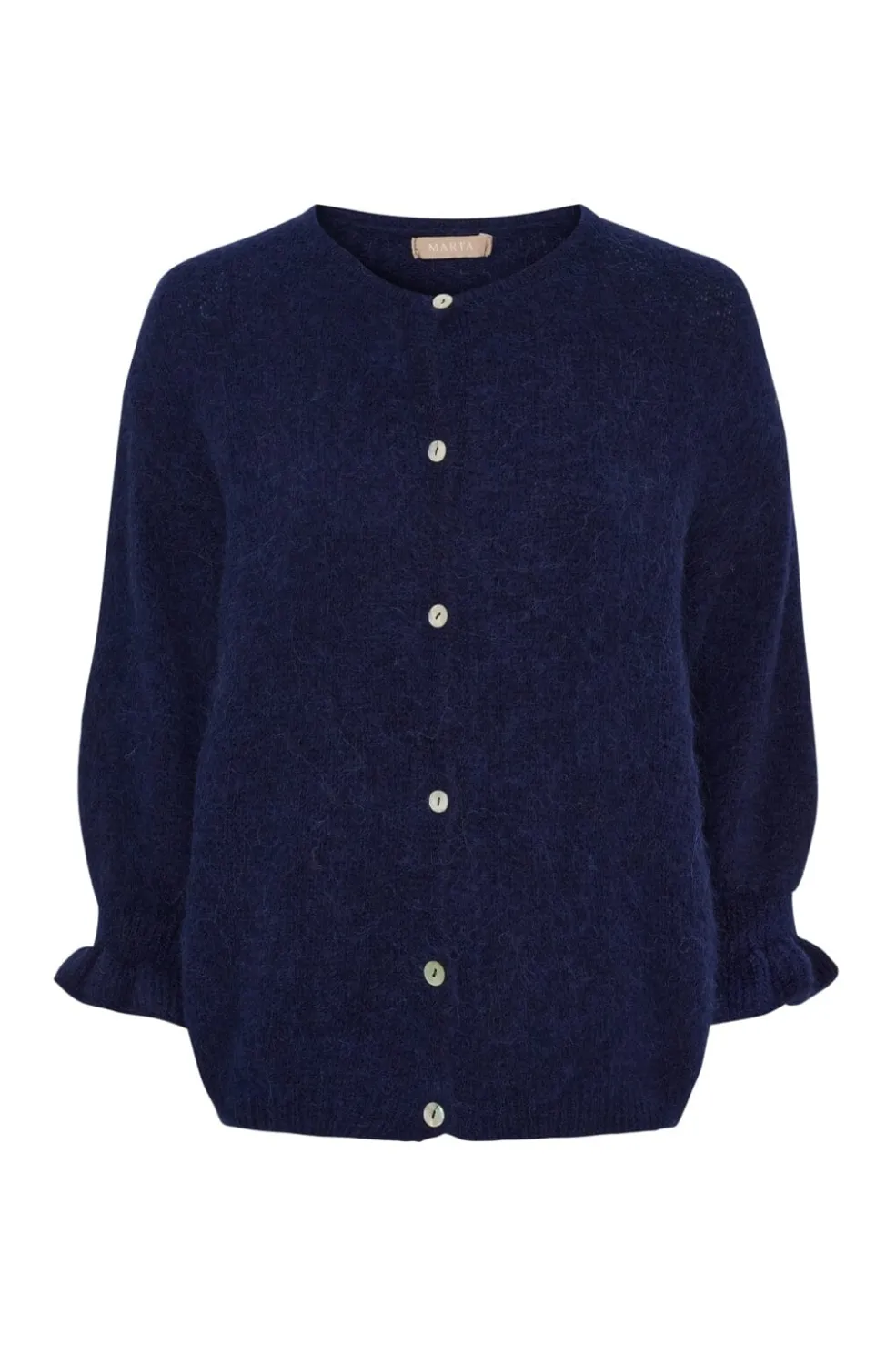 Mørkeblå strikket cardigan fra Marta Du Chateau med rund halsudskæring og knapper langs forsiden. Cardiganen har 3/4-ærmer med samlede manchetter.