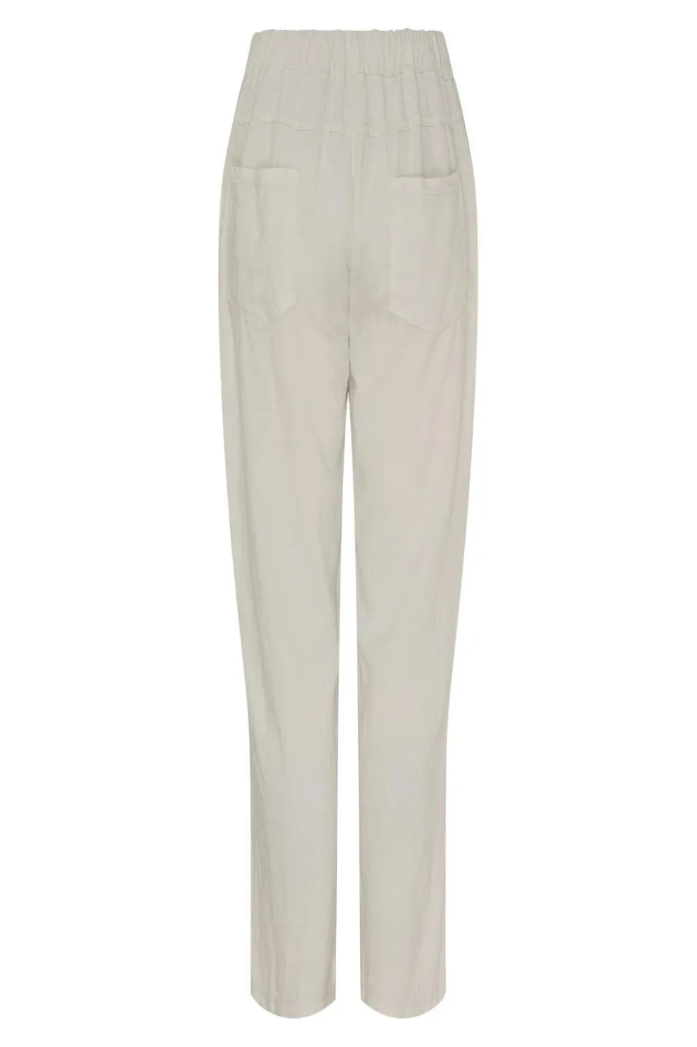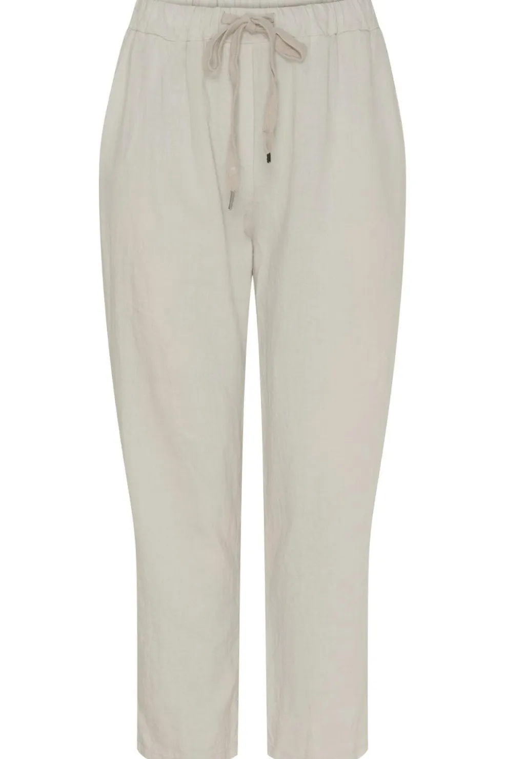 Beige bukser i lækkert stof med snøre og elastik i taljen. Bukserne har en lige pasform og går til midt på læggen. To praktiske baglommer giver bukserne et afslappet udtryk.