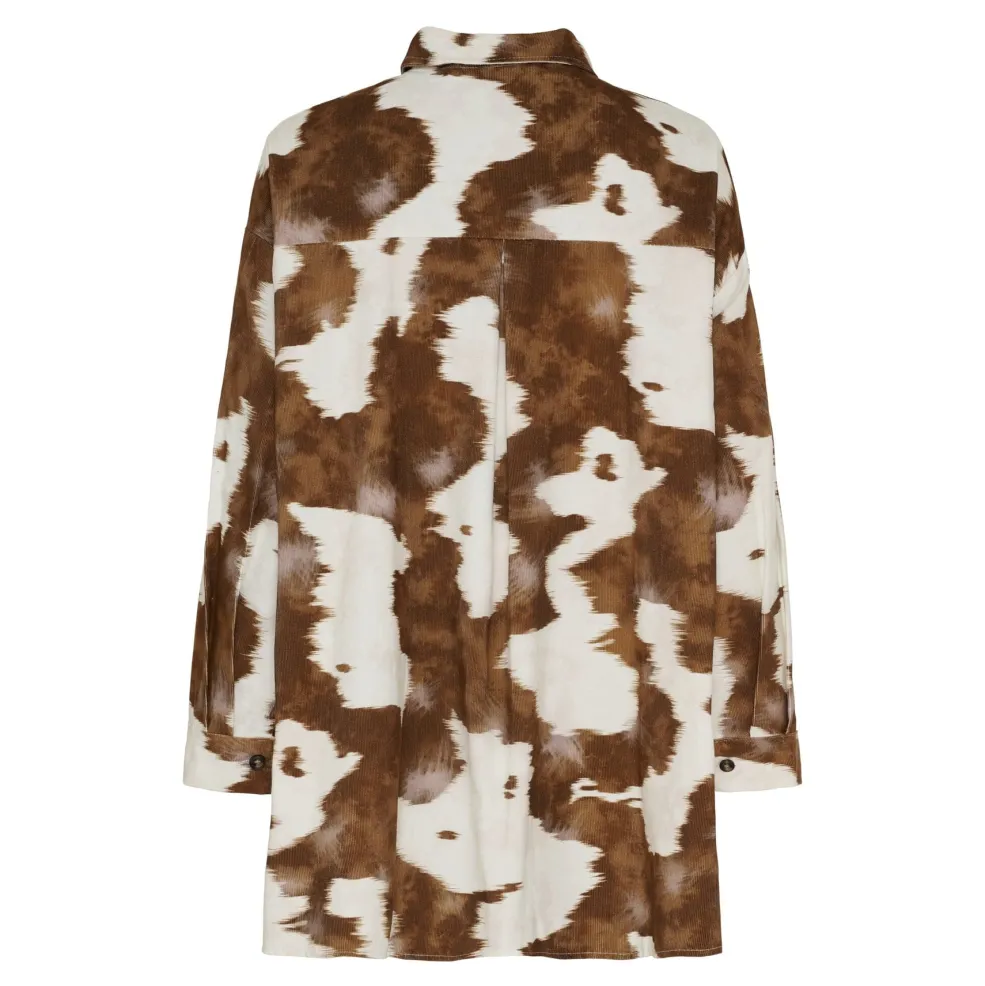Skjorte fra Marta Du Chateau med et brunt og hvidt ko-inspireret mønster. Den har skjortekrave, lange ærmer og brystlomme på venstre side.