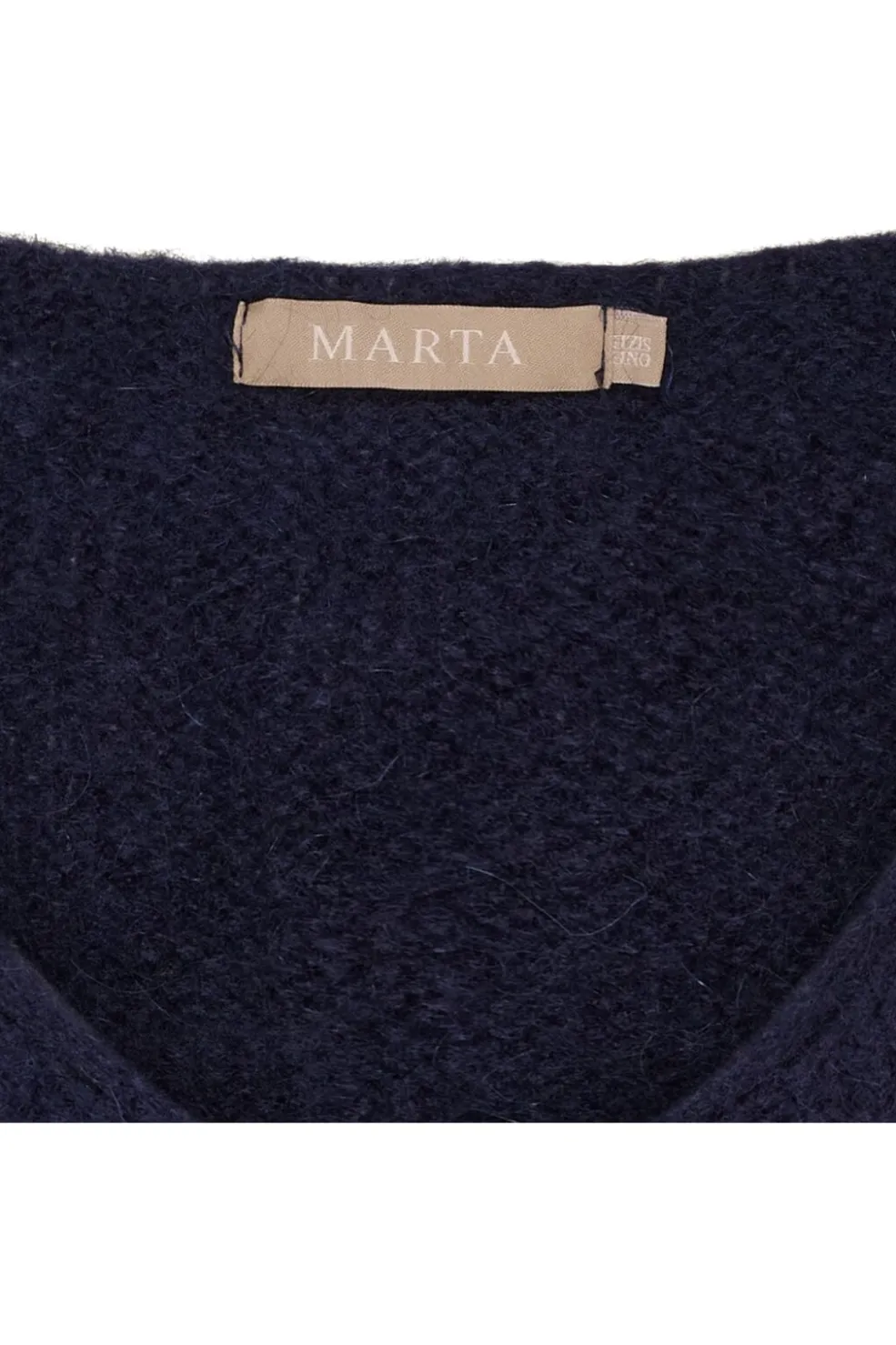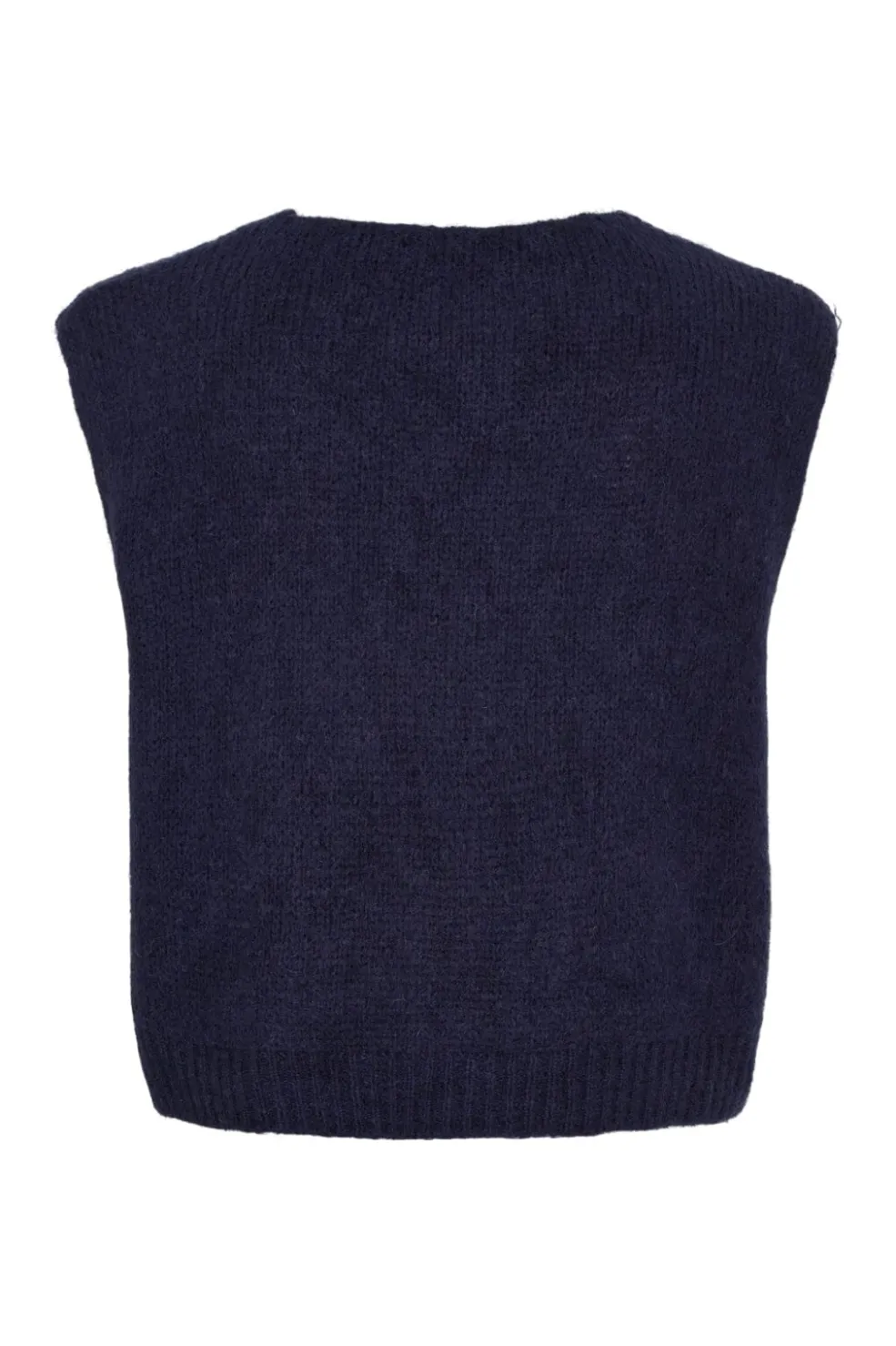 Mørkeblå vest fra Marta Du Chateau med V-hals og ærmeløst design. Vesten har en ribkant forneden og er strikket i en blød blanding af mohair og uld.