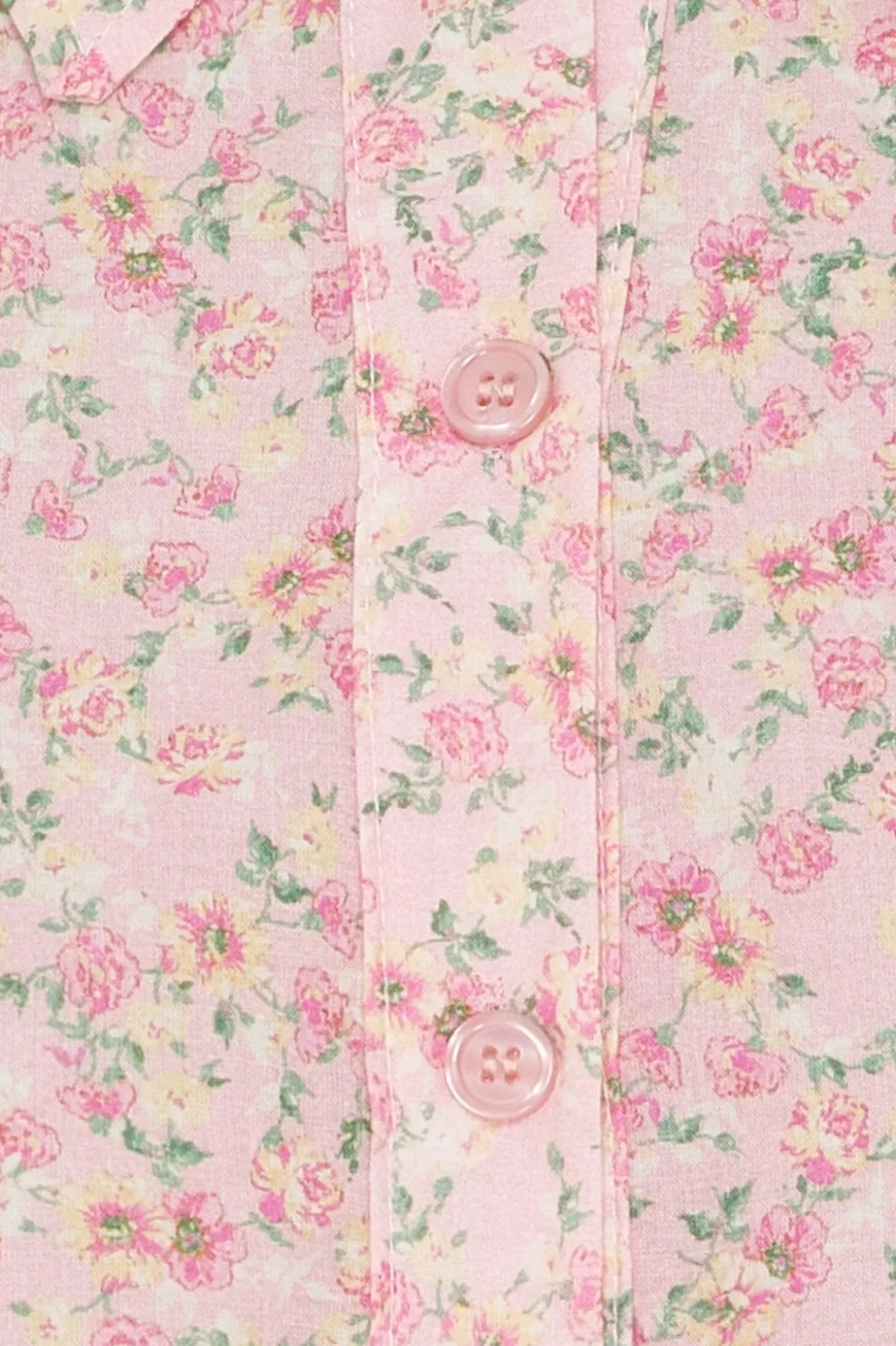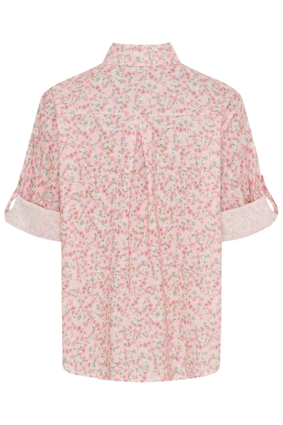 Skjorte fra Marta Du Chateau med et blomstret mønster i lyserøde og grønne nuancer. Skjorten har skjortekrave og korte ærmer, der kan slås op.