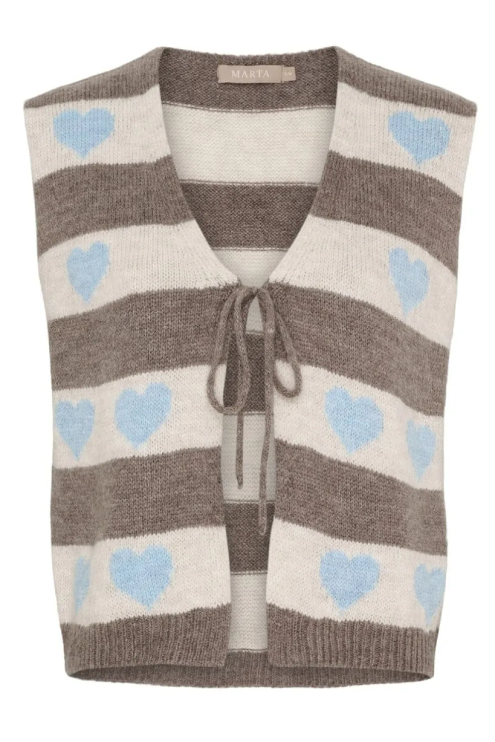 Strikket vest fra Marta Du Chateau med brune og hvide striber. De lyseblå hjerter på de hvide striber skaber et legende mønster. Vesten har V-hals og bindebånd foran.