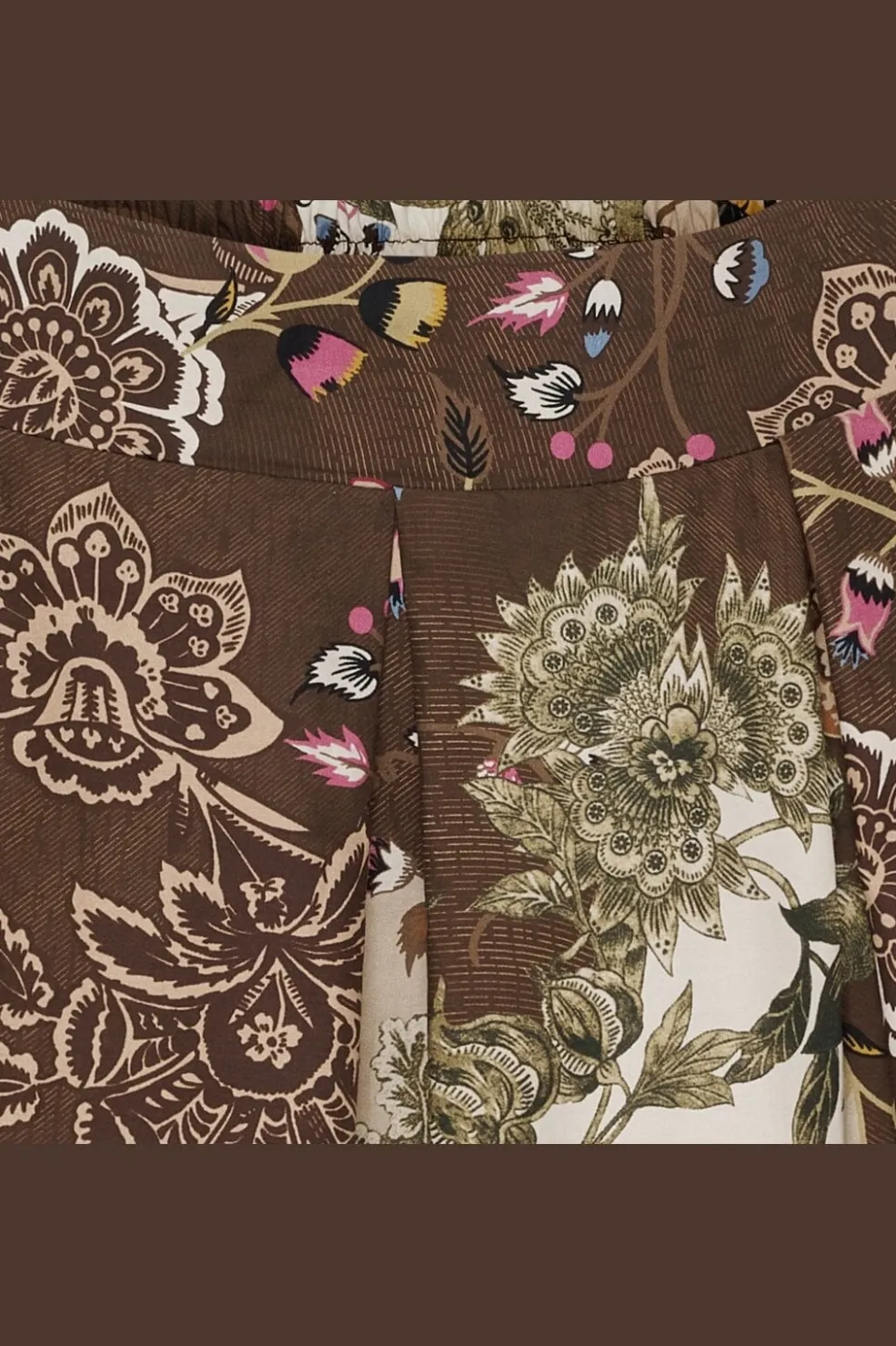 Brun nederdel fra Marta Du Chateau med blomsterprint i pink, hvid og grøn. Den plisserede nederdel har elastik i taljen og går til midt på skinnebenet.