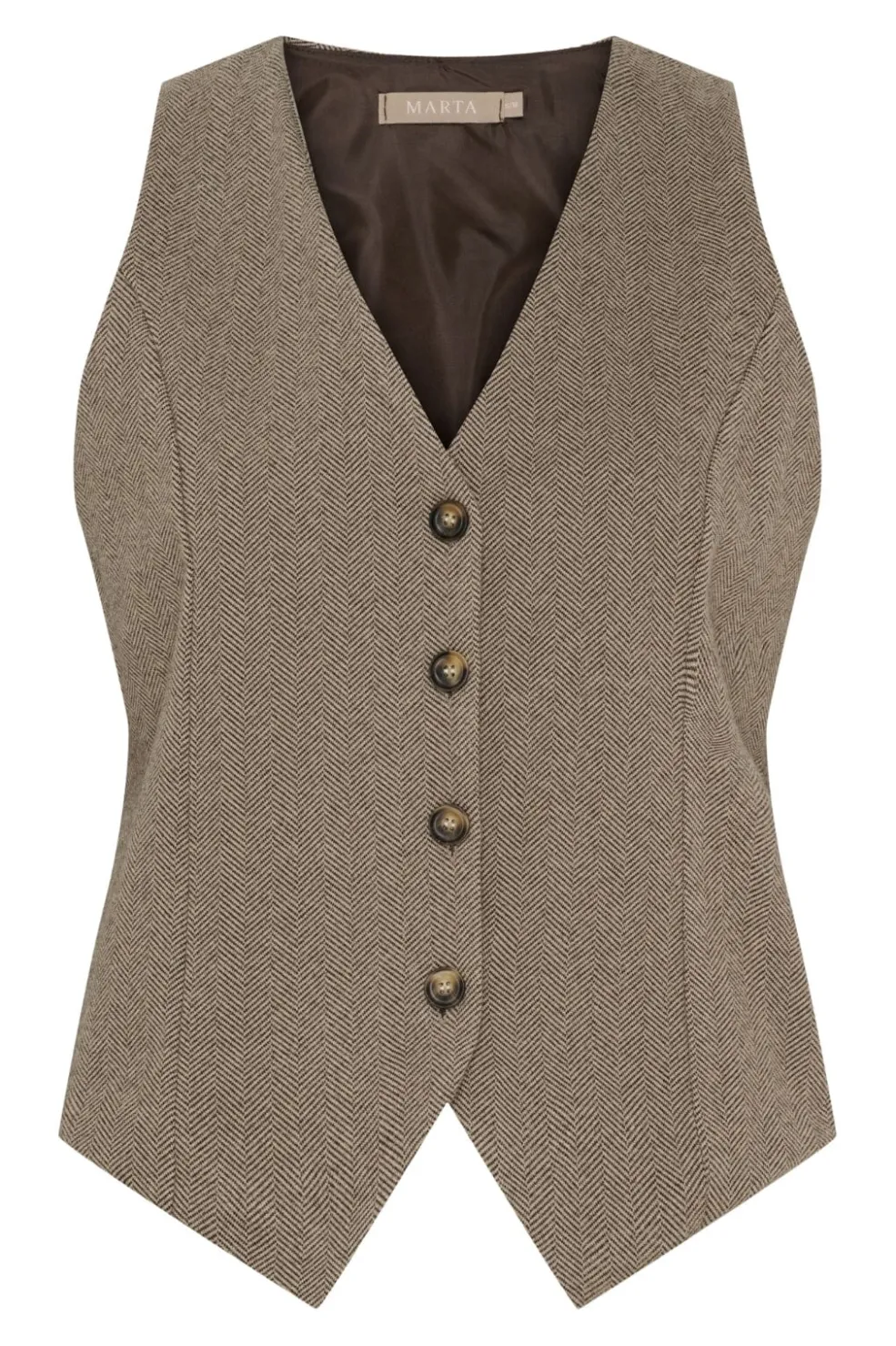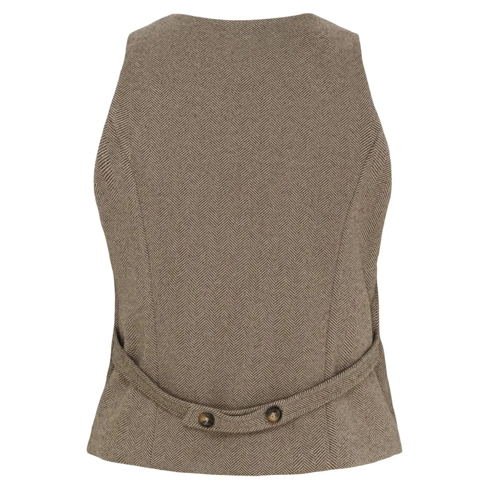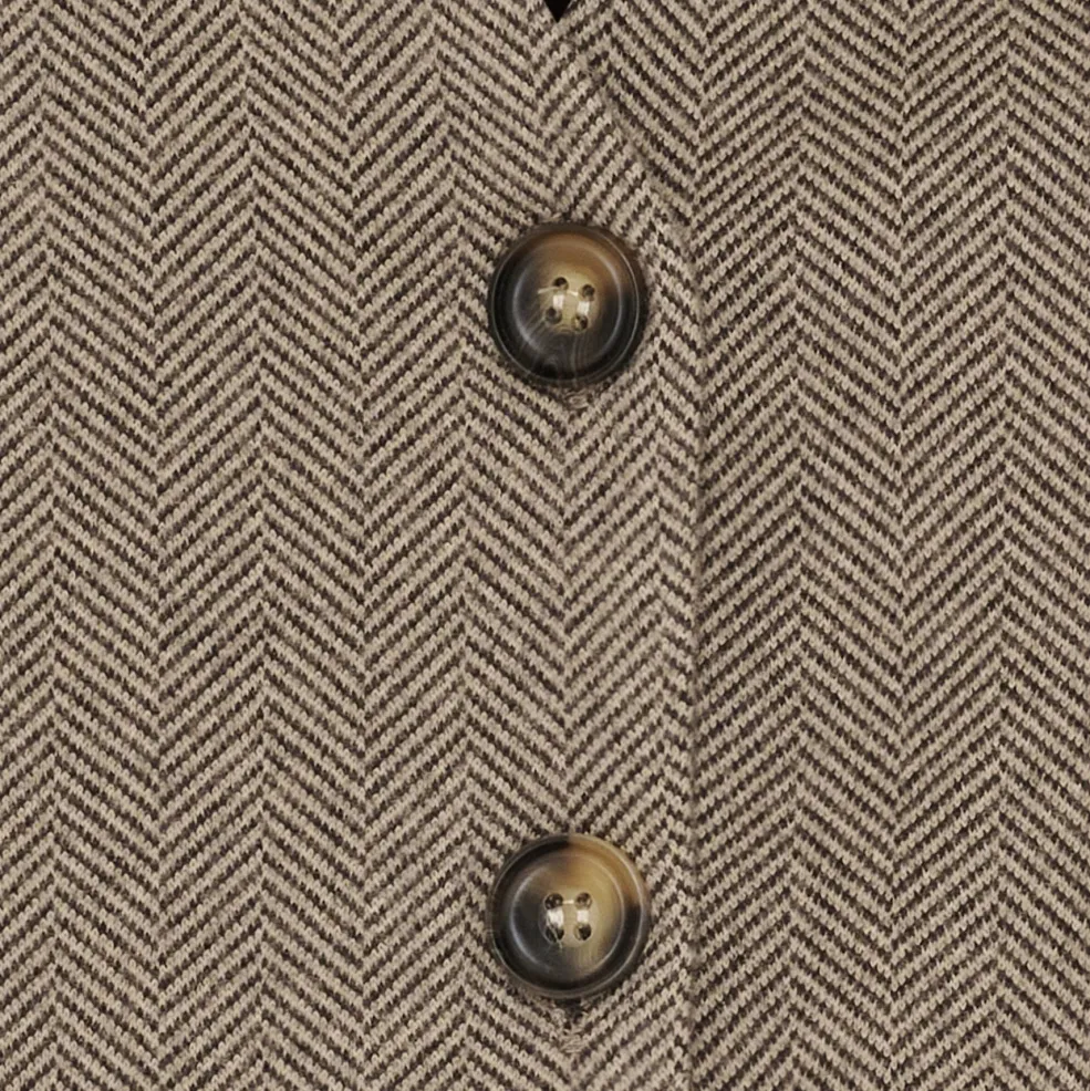 Grå vest fra Marta Du Chateau med herringbone-mønster. Vesten har en V-halsudskæring og knapper foran. Den kan bruges til både hverdag og fest.