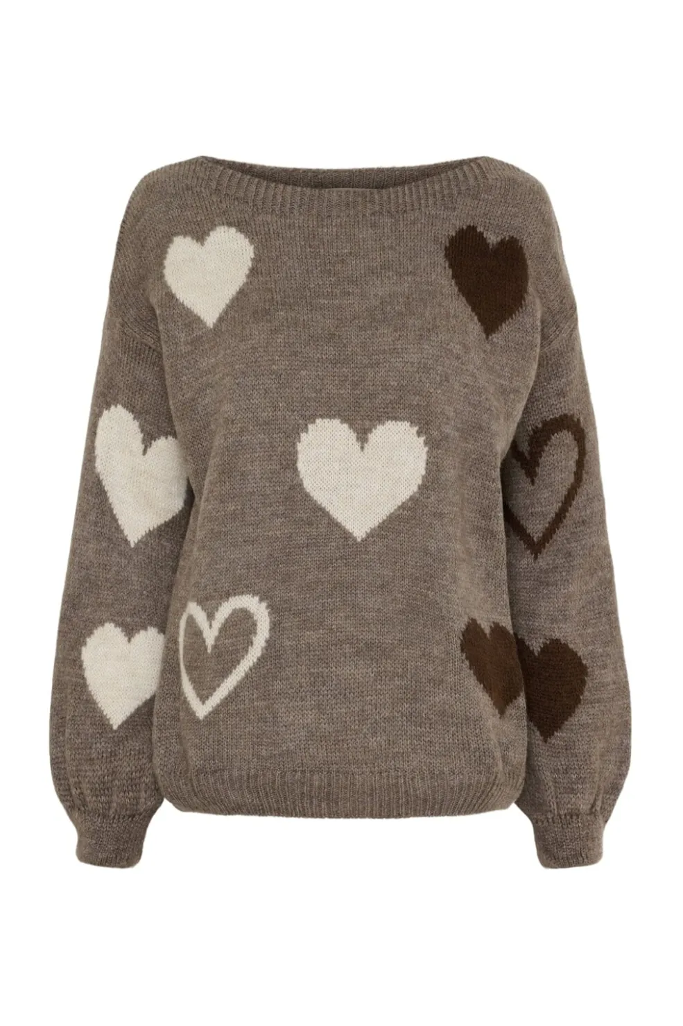 Brun strik fra Marta Du Chateau med hvide og brune hjertemønstre. Strikken har en løs pasform og ribkant ved halsen og ærmerne.
