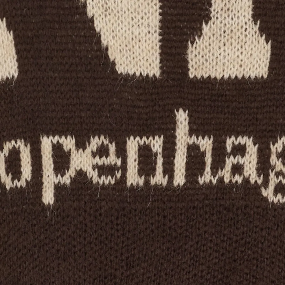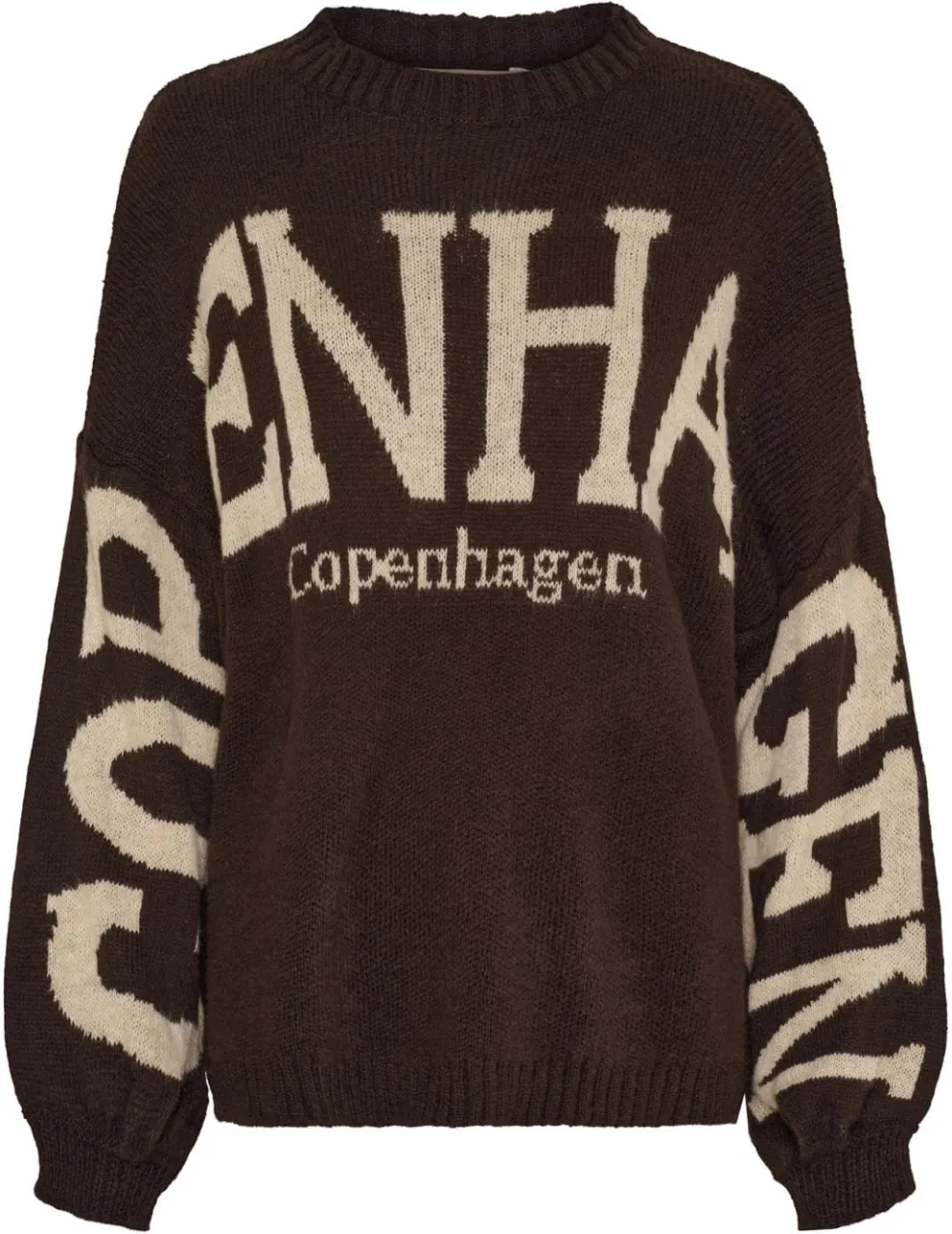 Mørkebrun strik fra Marta Du Chateau med et printet tekstdesign i beige. Strikken har en oversized pasform og en rund halsudskæring.