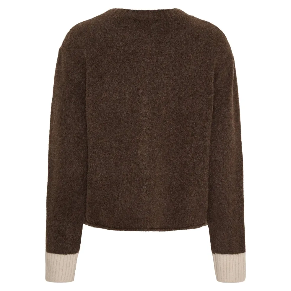 Brun striktrøje fra Marta Du Chateau med beige manchetter og knapper langs fronten. Et lille hjertemotiv sidder på venstre side af brystet.