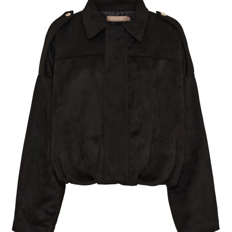 Sort jakke fra Marta Du Chateau med klassisk krave og skjult lukning foran. Jakken har epaulet-detaljer på skuldrene og dekorative syninger.
