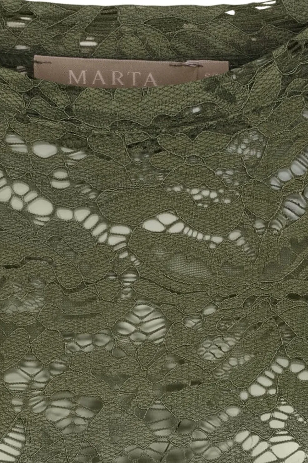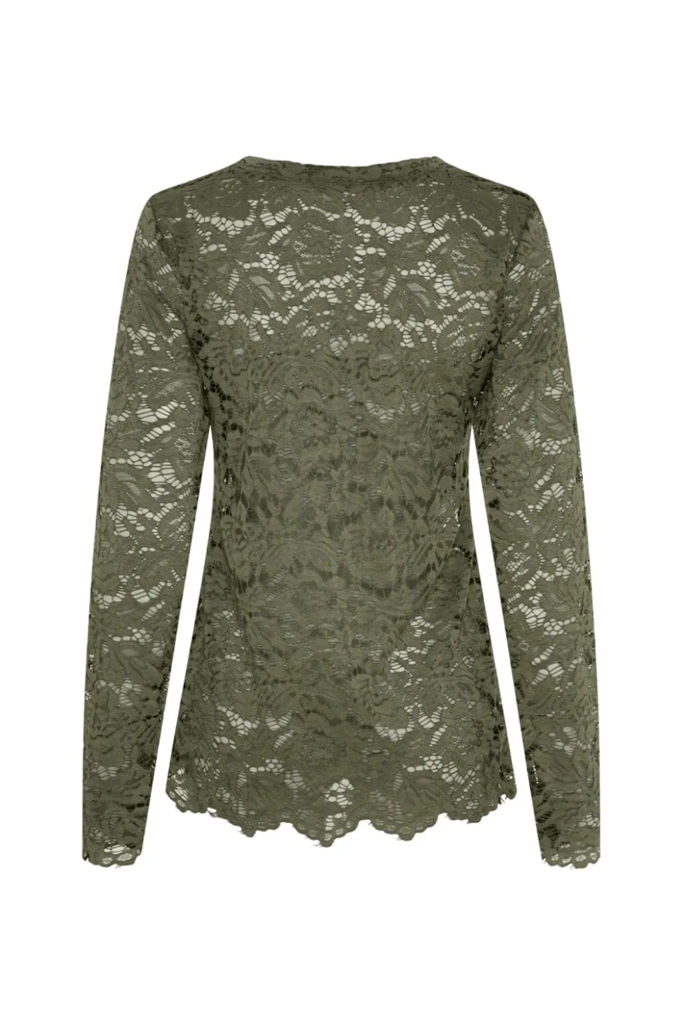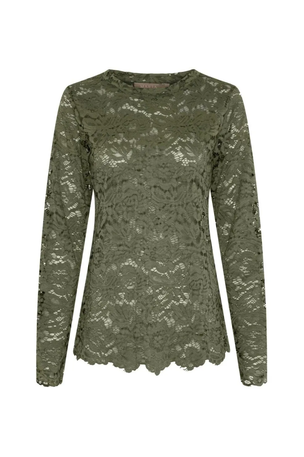 Langærmet t-shirt fra Marta Du Chateau i militærgrøn med et blomstret blondemønster over hele blusen. Blusen har en rund hals og skulpturerede kanter.