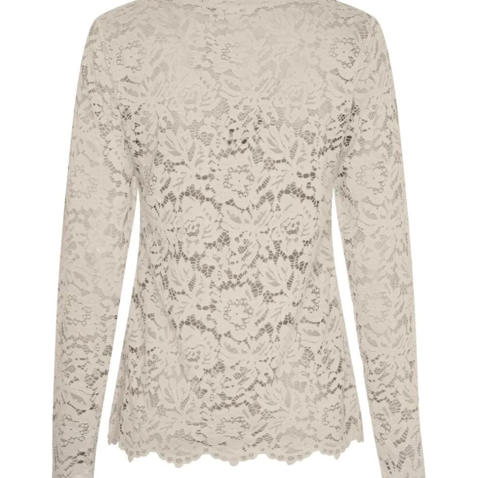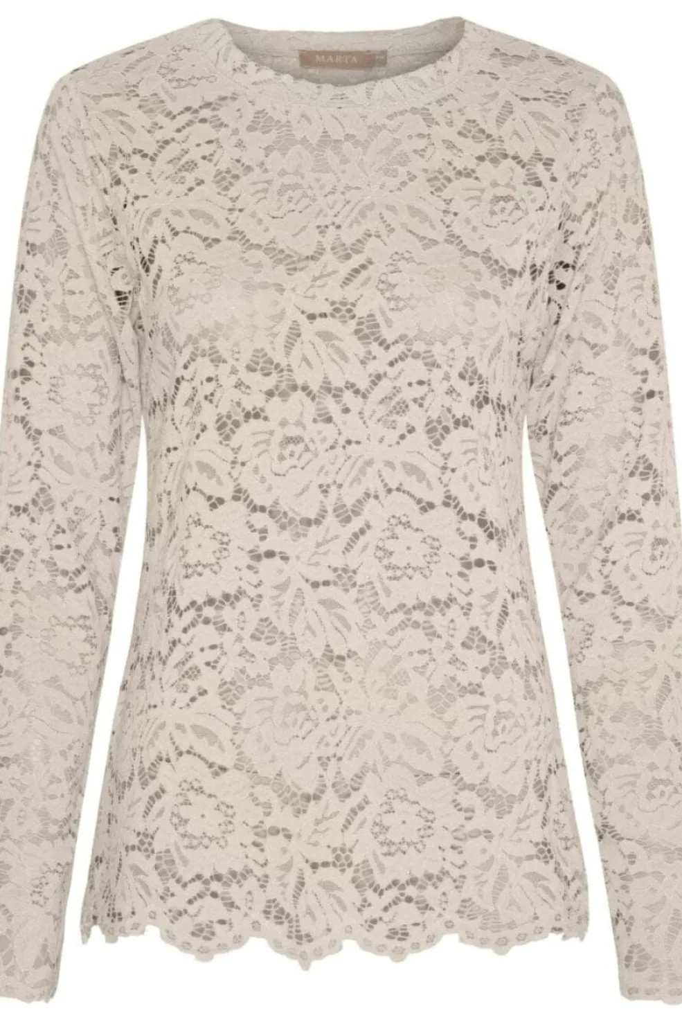 En beige blondebluse fra Marta Du Chateau med et blomstret mønster over hele overfladen og en bølget afslutning.