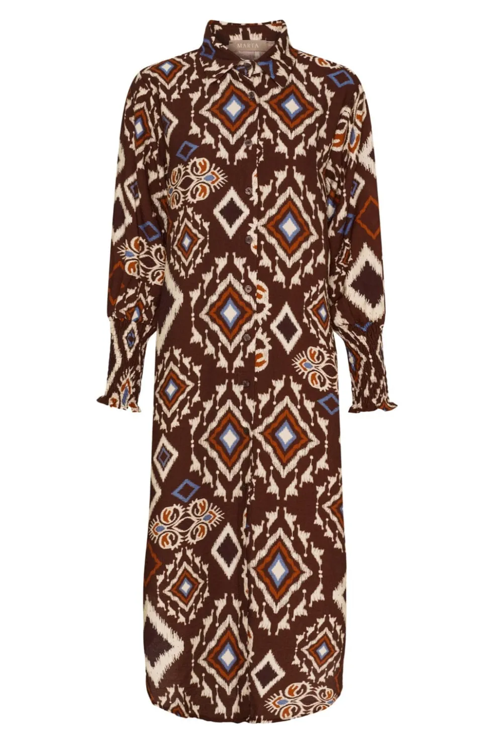 Brun kjole fra Marta Du Chateau med paisleymønster i blå og hvide nuancer. Kjolen har skjortekrave, knapper foran og lange ærmer med manchetter.