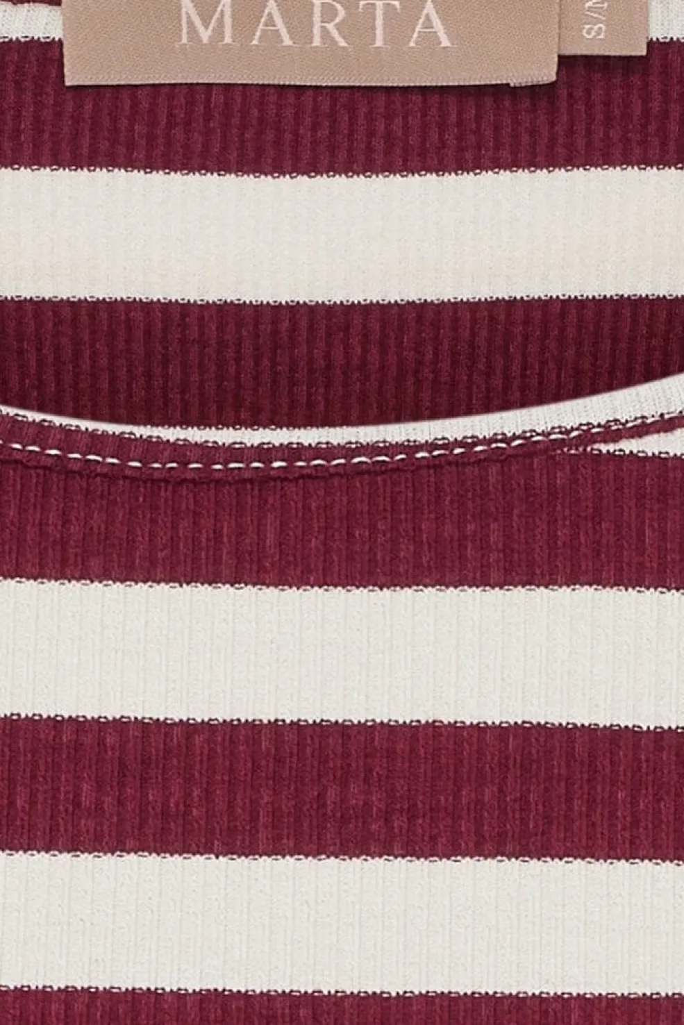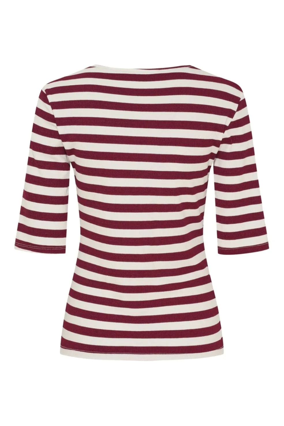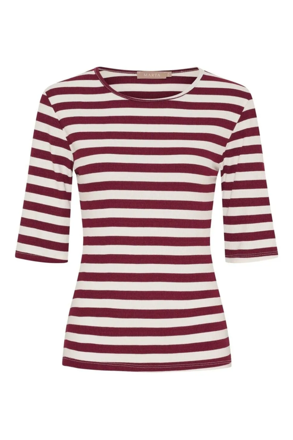 Stribet t-shirt fra Marta Du Chateau med vinrøde og hvide striber. T-shirten har en rund halsudskæring og trekvartlange ærmer.