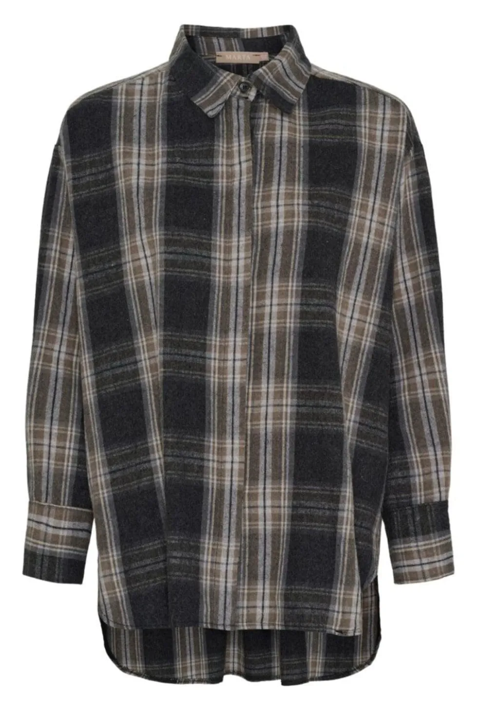 Ternet skjorte fra Marta Du Chateau i grå og brune nuancer. Den har en oversized pasform med skjortekrave og knaplukning.